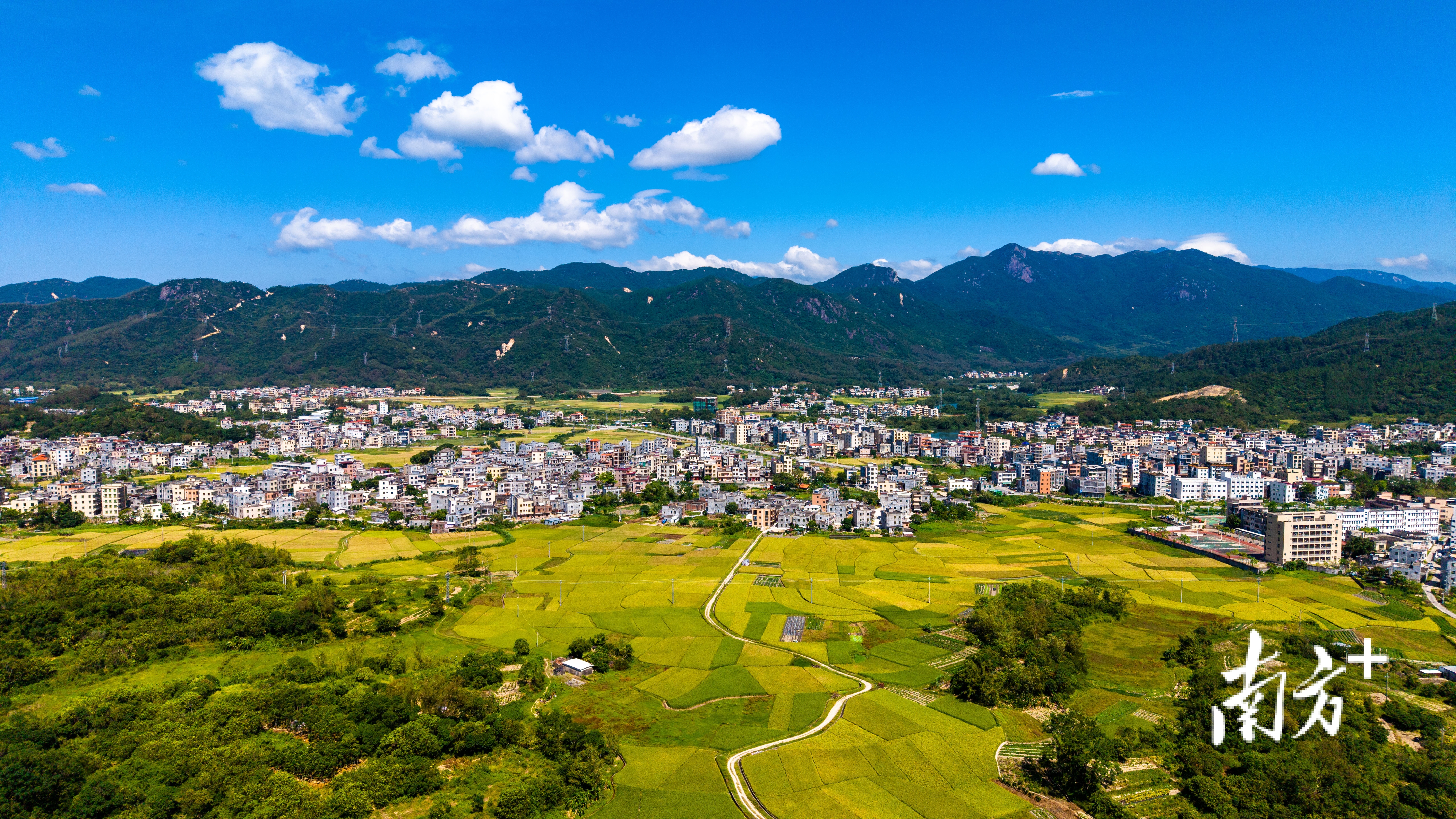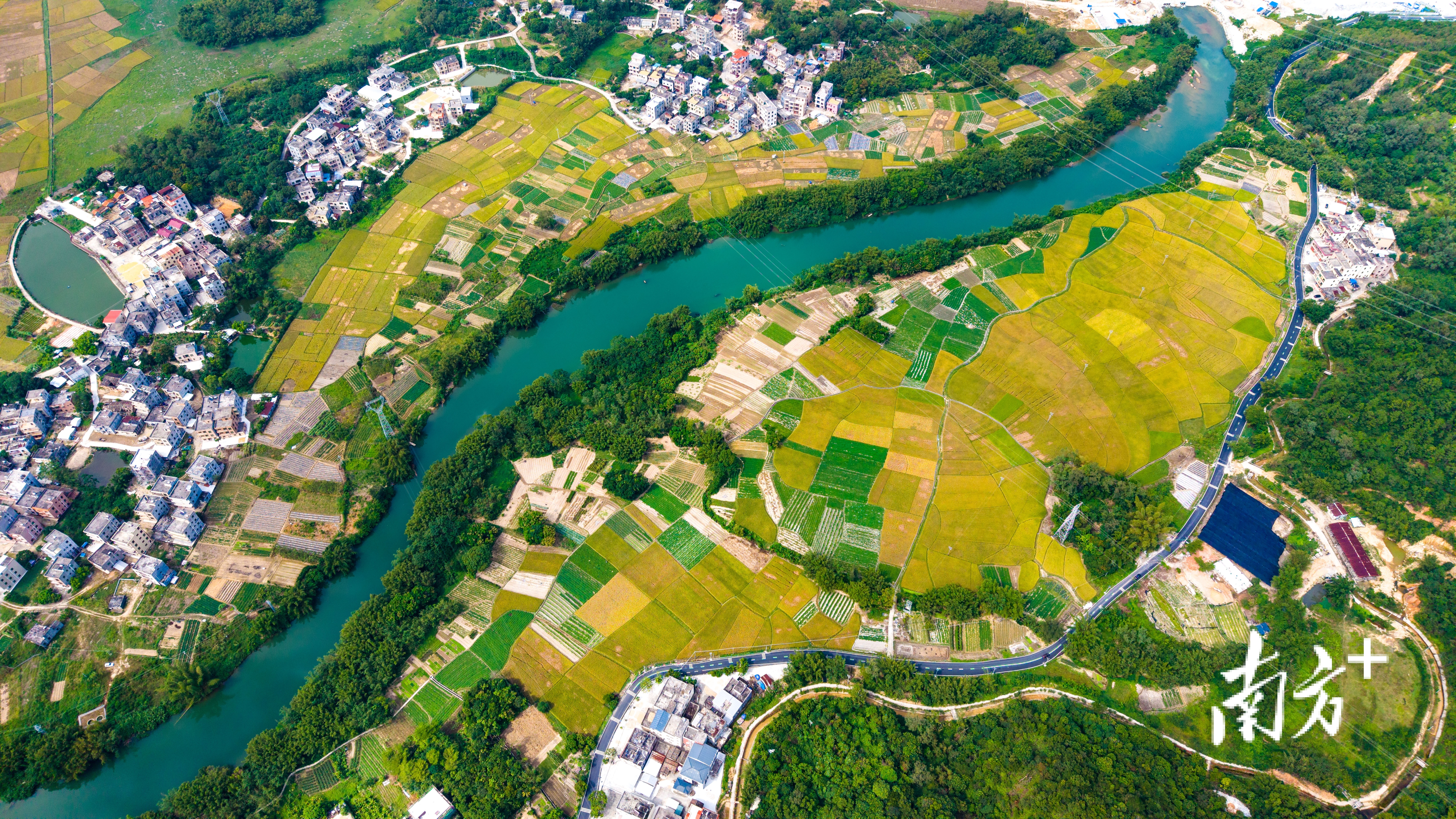 屋舍俨然,流水潺潺,稻浪翻涌,汇成乡村富足图景。