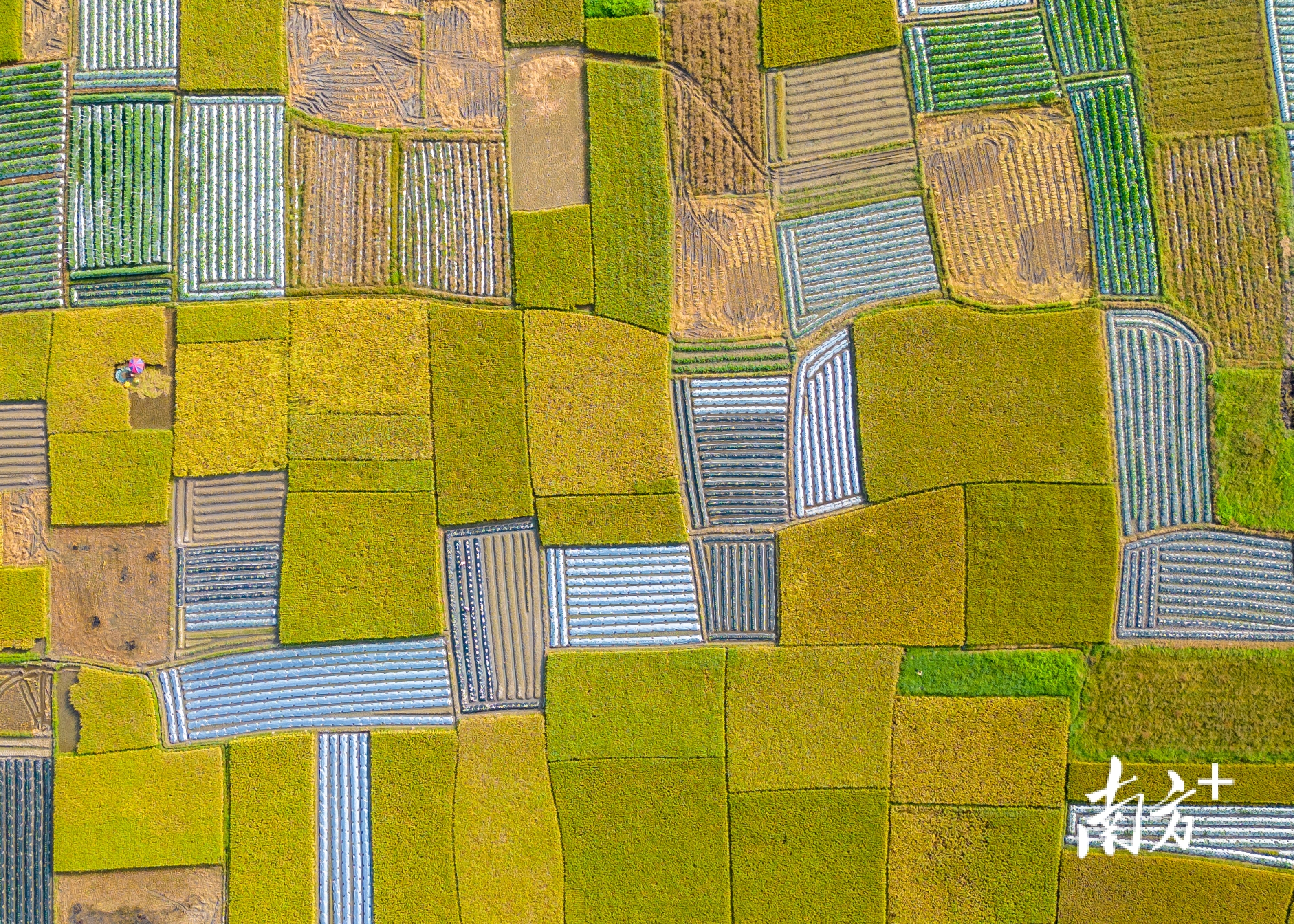 金黄稻浪与冬种绿苗相映成趣,为田野铺上了一条斑斓的地毯。