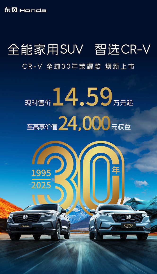 从走进国人生活,到为东风本田电动化、智能化新征程绘制蓝图,CR-V的30年既是用户信赖的见证,也是品牌向前的印记。