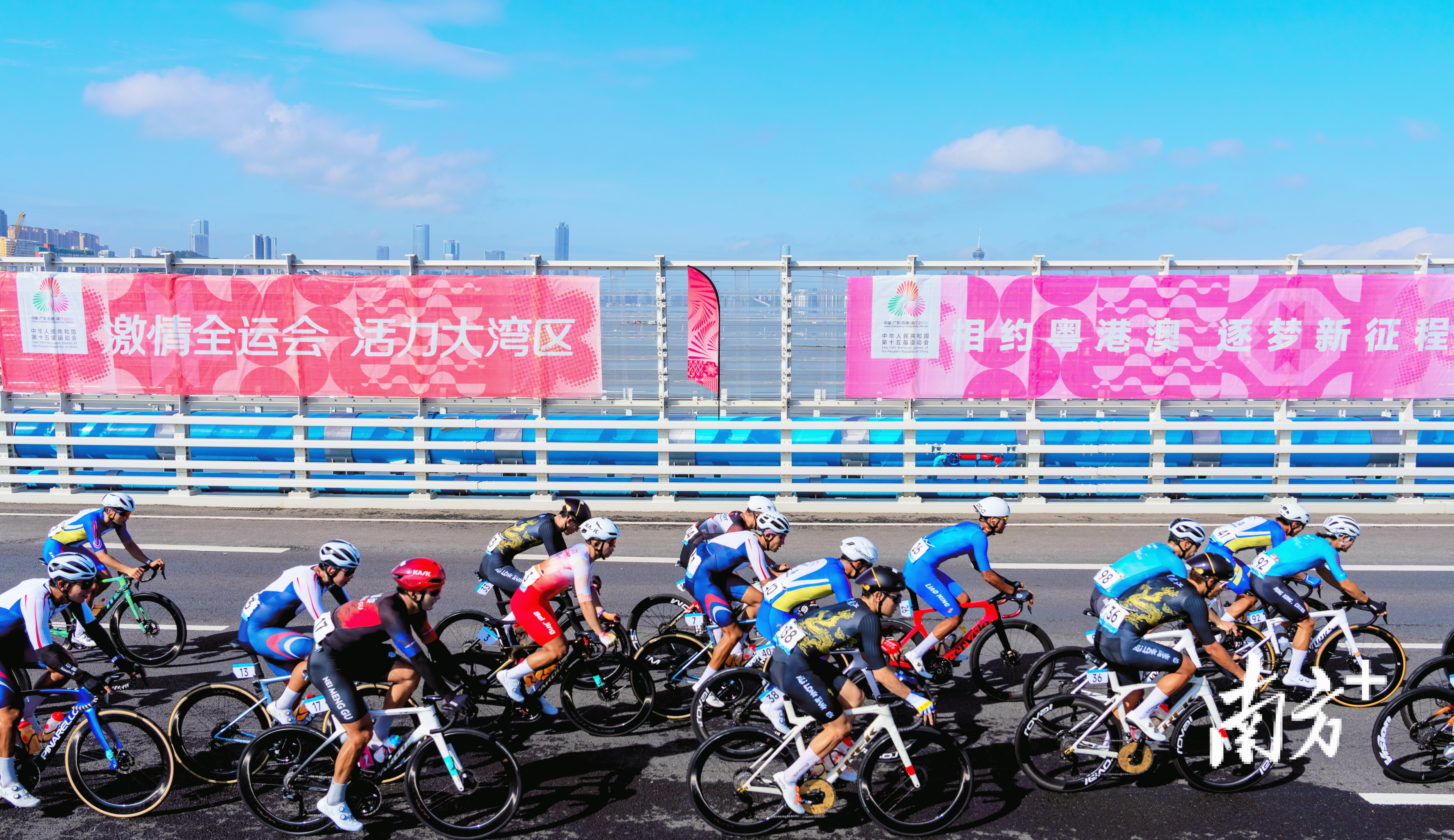 十五运会公路自行车男子个人赛,参赛选手在澳门大桥段赛道竞速。