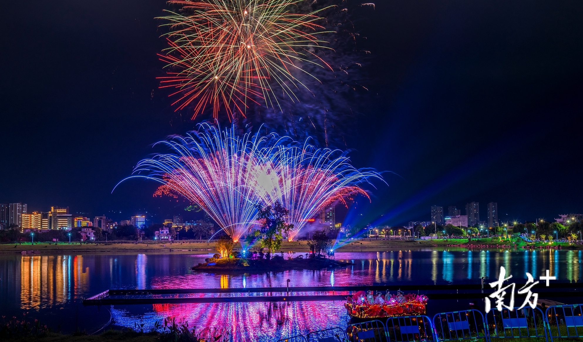 夜幕降临,连州湟川河畔流光溢彩。500架无人机编队腾空,在夜空中勾勒出“连州欢迎您”的璀璨图景;3D水幕烟花与瑶族布袋木狮舞交相辉映,游客在青年创业集市流连忘返。