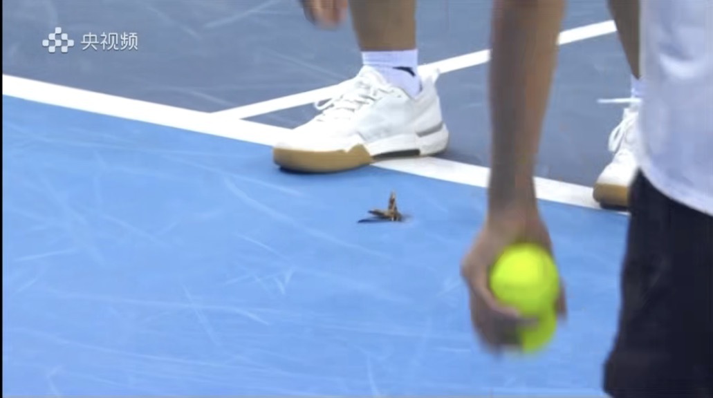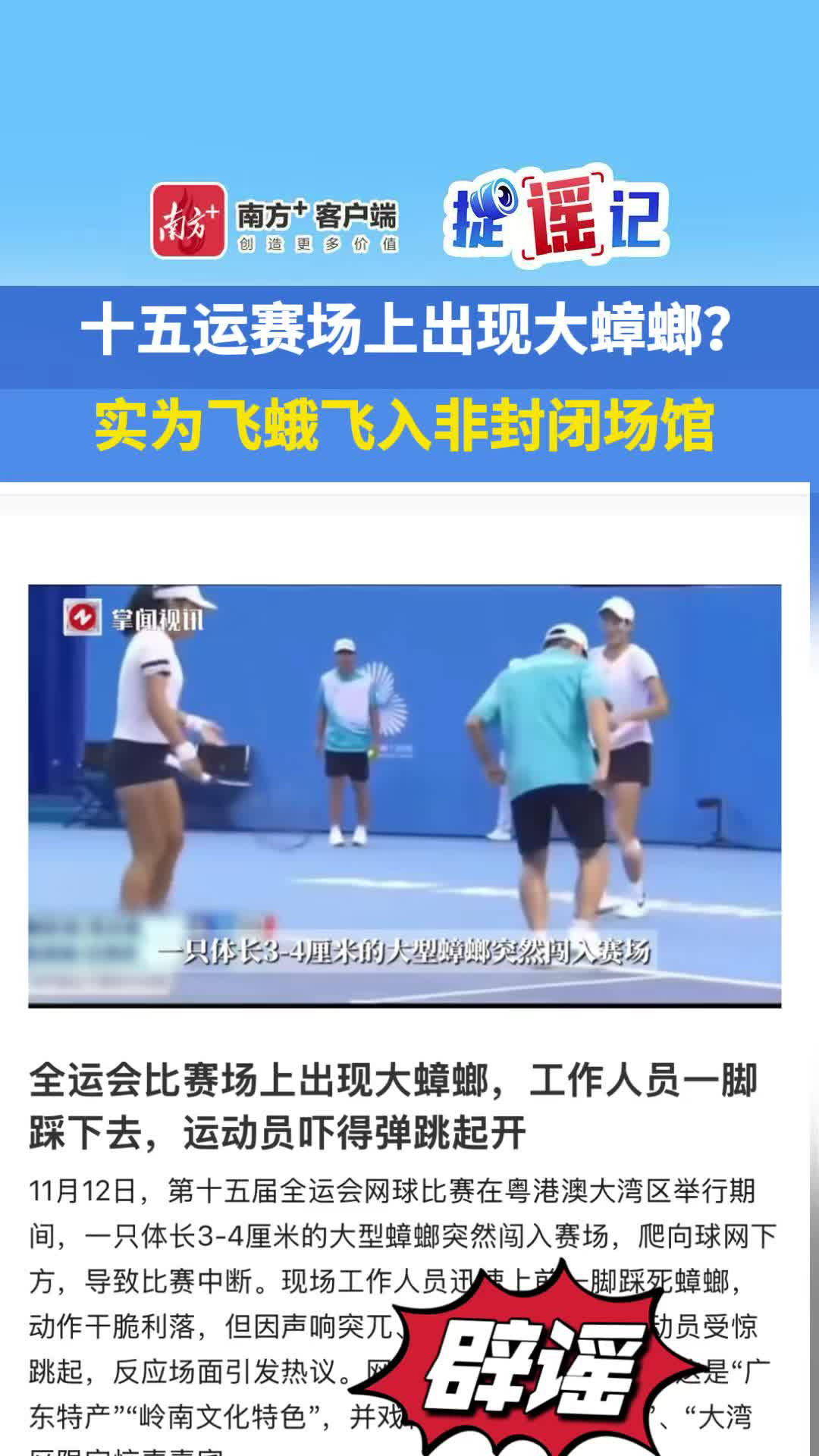 11月12日,第十五届全运会网球比赛在珠海举行,比赛期间一只昆虫闯入赛场,现场工作人员迅速处置。随后,有网传消息称“3—4厘米的大型蟑螂闯入赛场”“大蟑螂导致比赛中断”。