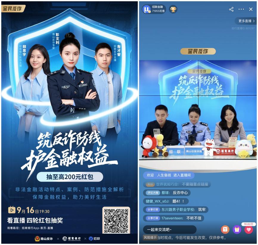 本期直播活动特别邀请南山公安反诈中心民警,以及来自招行、招联的反诈专家,分别围绕“兼职刷单”“机票退改签”“演唱会购票”“网络游戏交易”及“教育机构退费”五大典型诈骗场景展开深度解析。