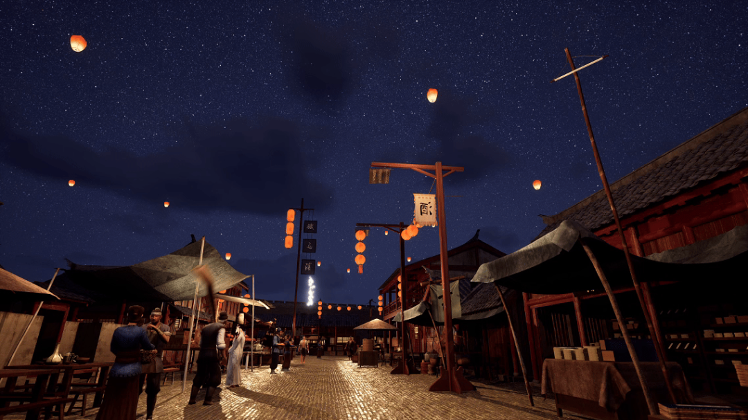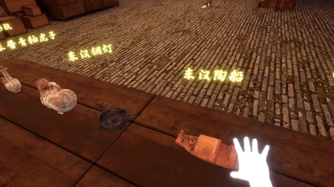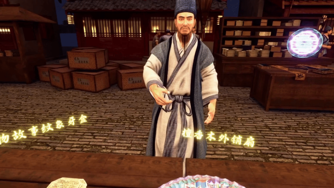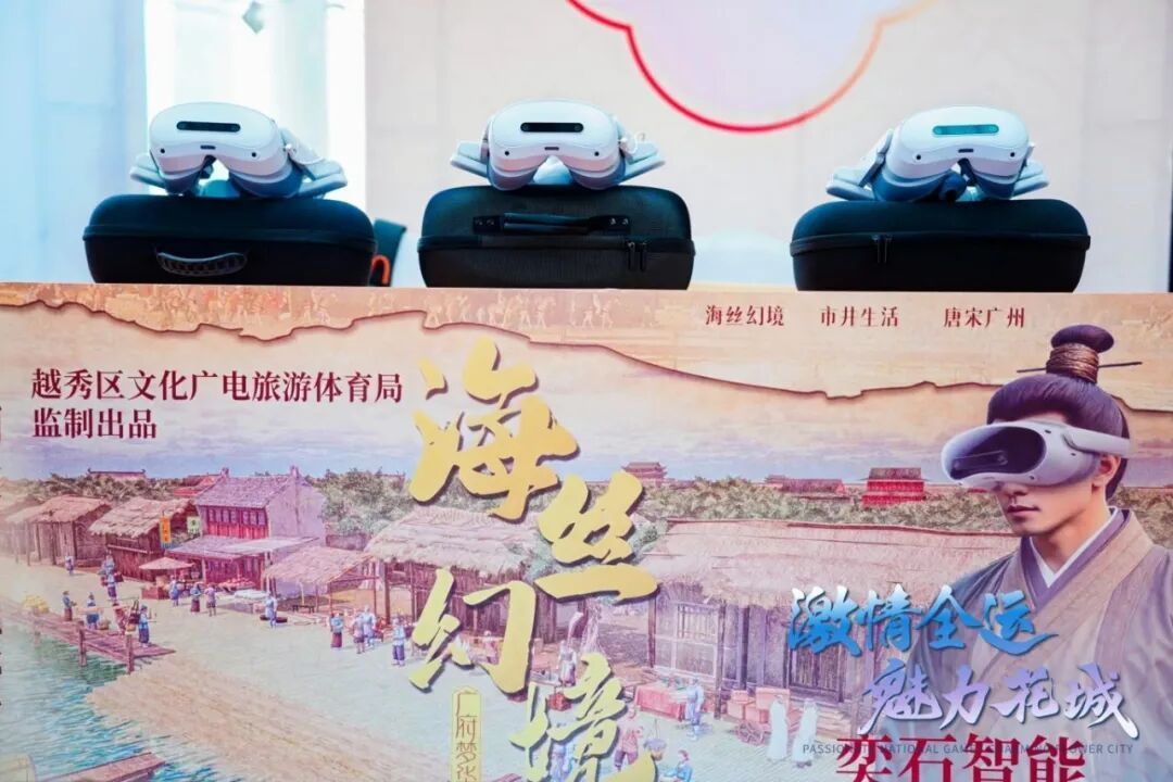 《广府梦华录》以海丝文化为核心,充分运用国际领先的虚幻引擎和VR技术,借助三维建模方式,精准复现了坡山渡口、怀圣寺光塔等海丝文化地标,匠心打造出一个可感知、能互动的数字场景。通过构建虚实交融的场景,观众能够体验多维时空穿梭:漫步在坡山古渡热闹非凡的市井之中,泛舟于蕃坊的商船之上,甚至还能“触摸”各类文物数字孪生体……