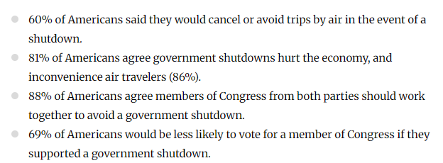 益普索 (Ipsos) 的一项调查显示,60%的美国人会在政府“关门”期间取消或避免航空旅行,81%的人认为政府停摆会损害经济,86%的人认为这会给旅行者带来不便。