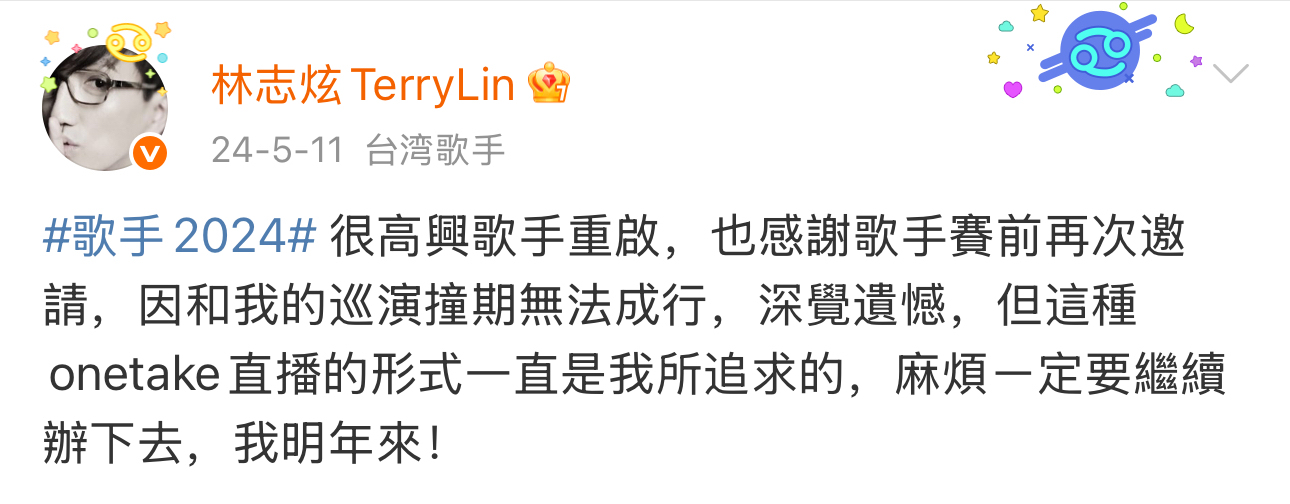 为了遵守这一“公开的承诺”,林志炫特意请团队在2025年留出4个月的档期,做好参加《歌手2025》的准备:“虽然《歌手》并没有告诉我明年是否发我,但守信的本质不在对外界负责,而是对内心的遵从,所以我当下就请团队按《2024歌手》邀请时所给的档期将时间全部空下来,而为预防《歌手》因为相关因素而挪动档期,我请团队前后多留半个月的弹性空间。也就是2025年4月中旬至8月中旬足足4个月的时间完全不接通告。”