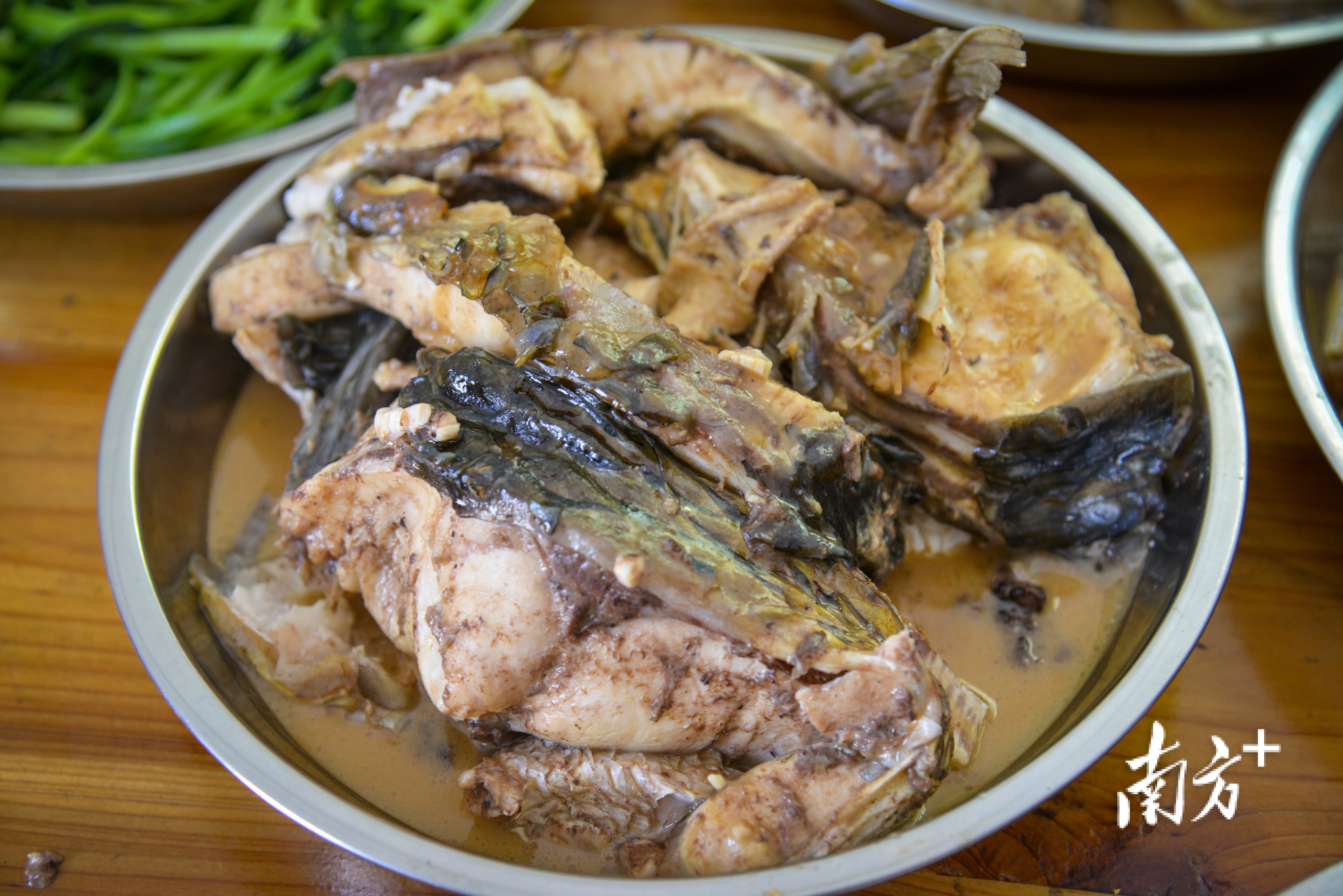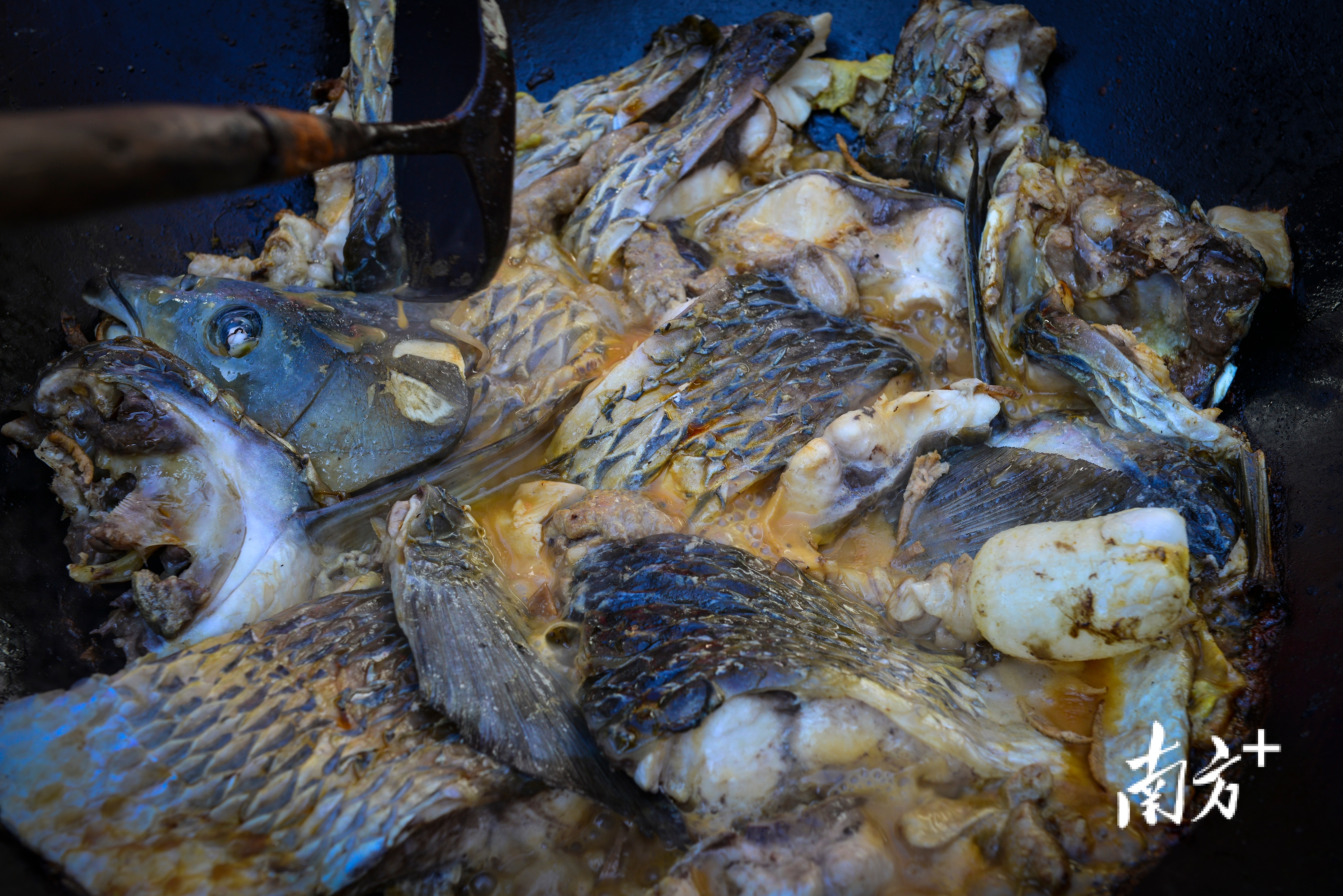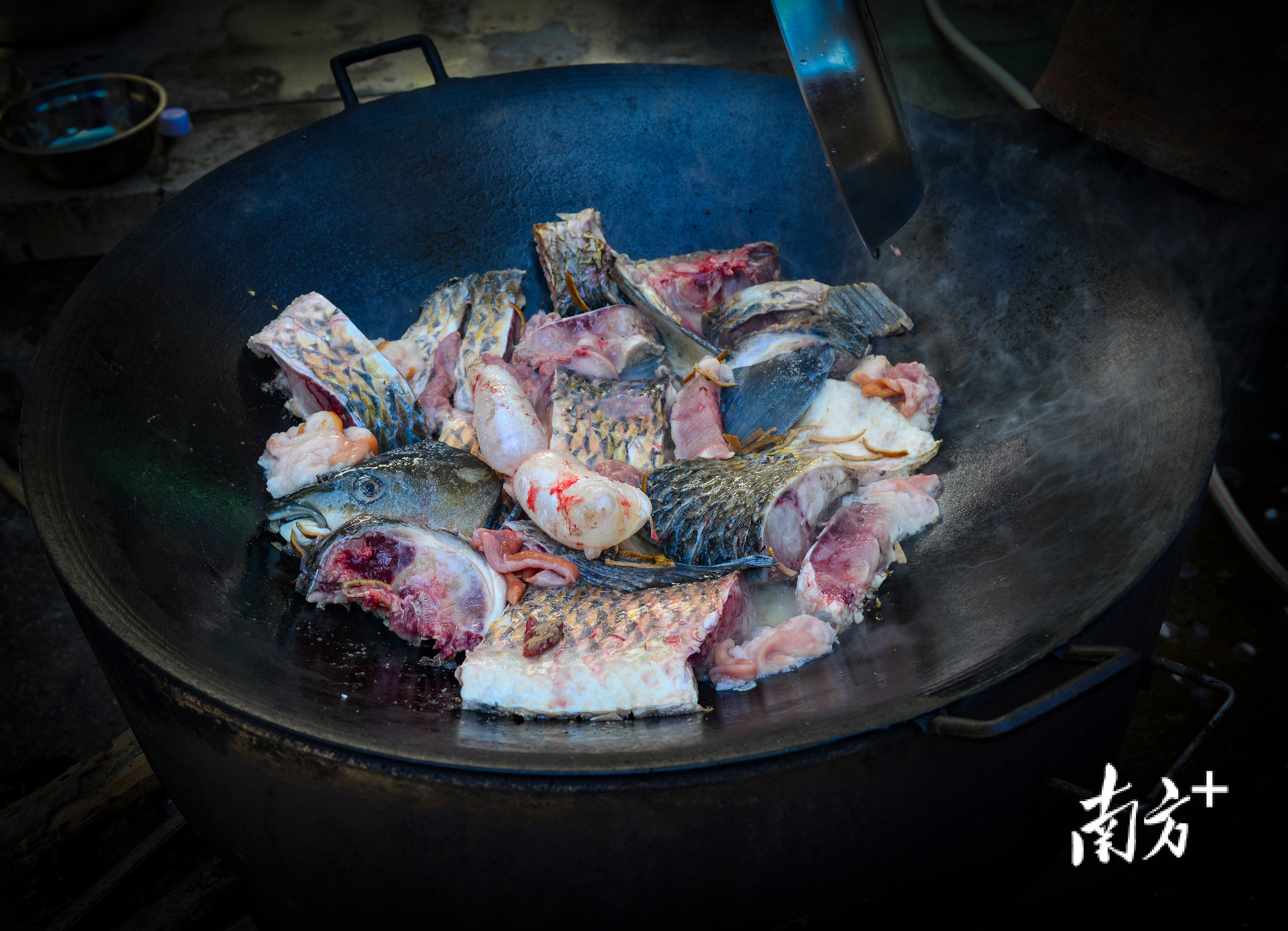 制作时,需现场捕捞起一条约十斤重的圭岗氹仔鱼。经过精心清理后切成大块,再用盐油简单腌制备用。接下来,厨师用柴火烧热大铁锅,将腌制好的鱼肉均匀放入锅中,细火慢煎。待鱼的两面微微焦香,再佐以陈皮、姜片以及少量生抽,利用渗出的鱼油鱼汁继续慢火细焖。