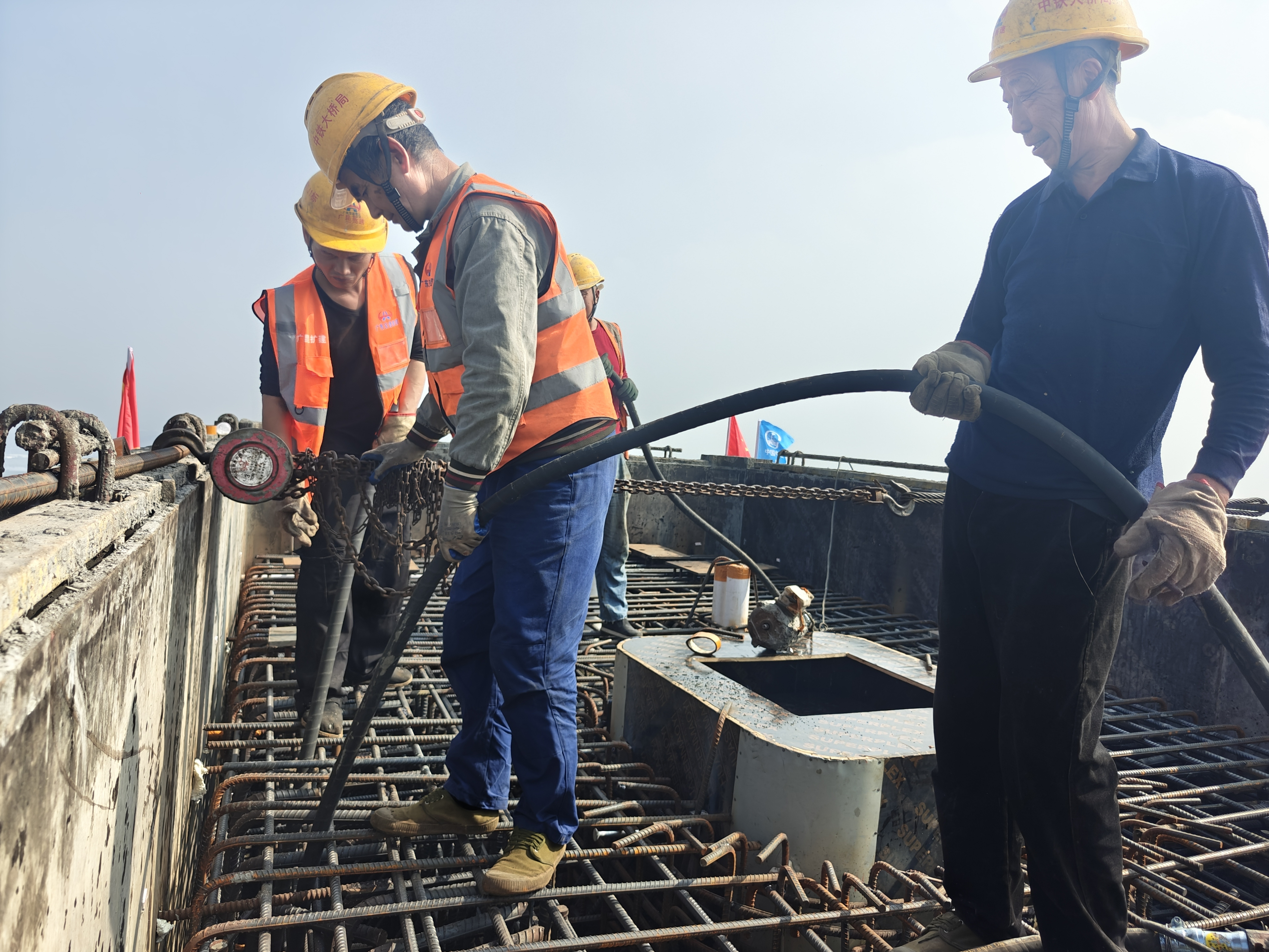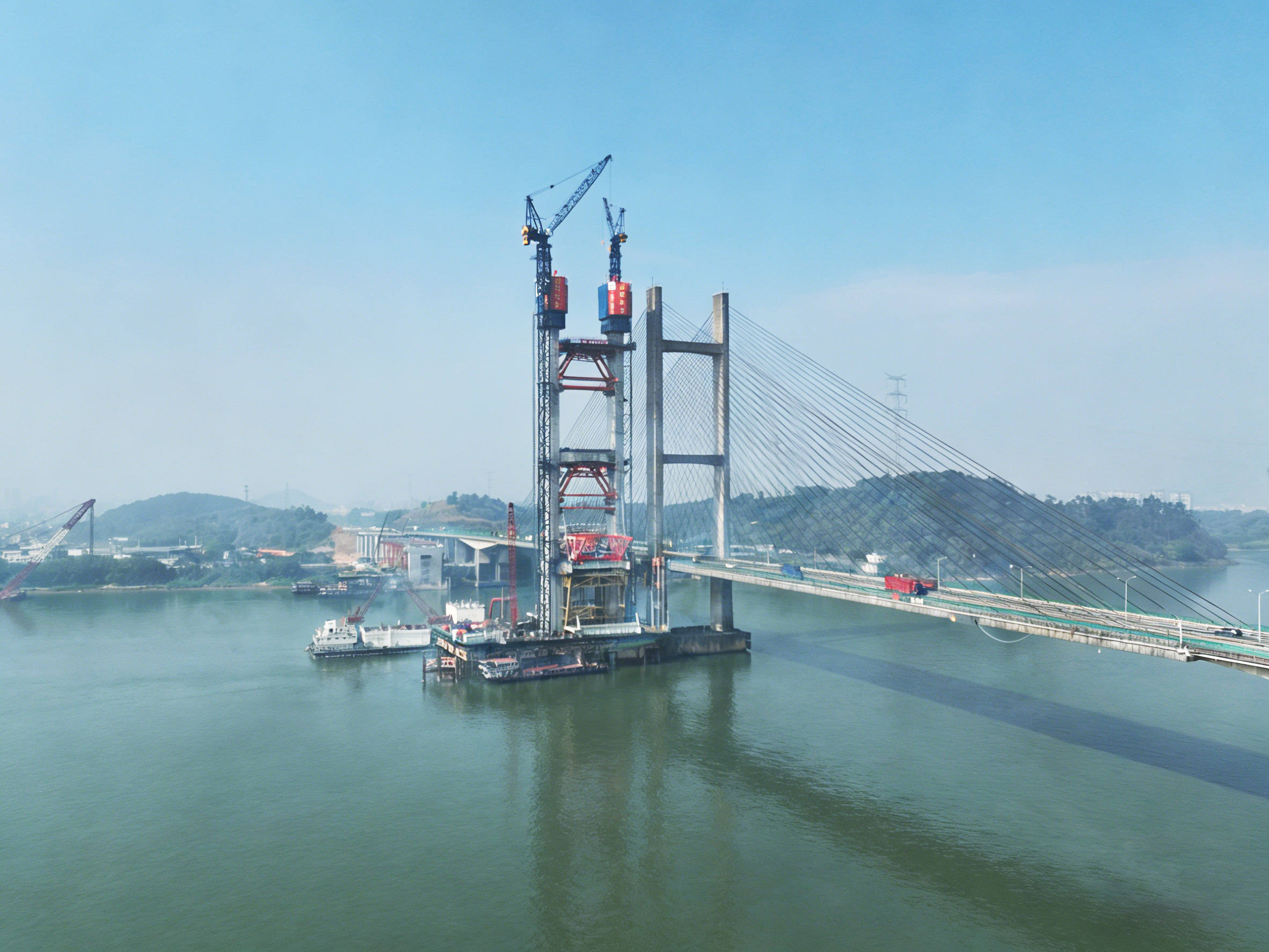 西江水文条件复杂、大体积混凝土温控要求严苛、结构线形控制精度极高——面对一系列施工难题,项目团队以技术创新破局,全面推广应用液压爬模、BIM建模、智能张拉、高性能混凝土、钢筋锥套连接等一批先进工艺与材料,实现施工质量与效率“双提升”。