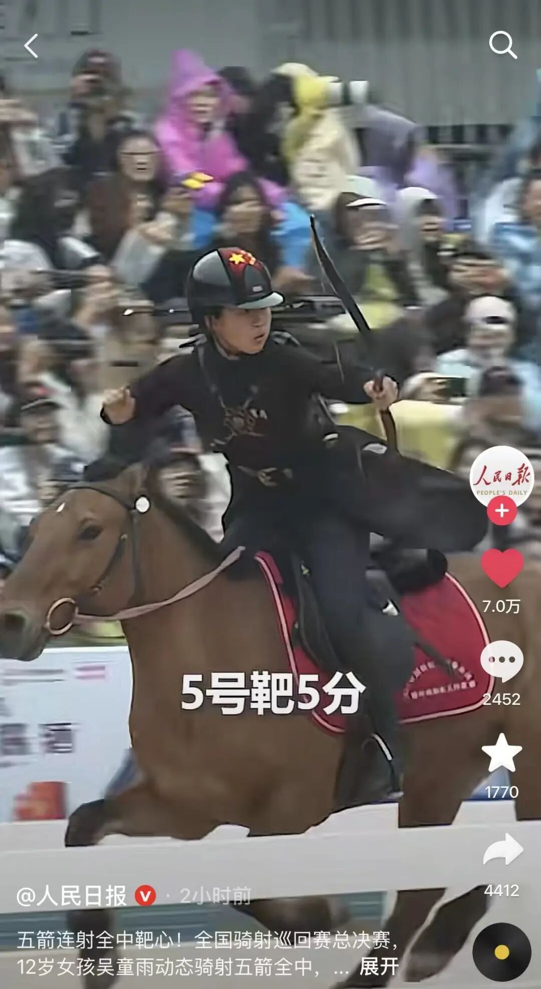 12月13日,2025全国骑射巡回赛总决赛在光明区红花山体育中心落幕,吴童雨一举夺得中国三姿个人冠军、光启式团体冠军、公开组年度积分总冠军,成为全场焦点。她策马奔驰、张弓搭箭的视频被新华社、人民日报等各大平台转发,迅速引爆网络,“少女将军”“小孩姐”等赞誉纷至沓来。