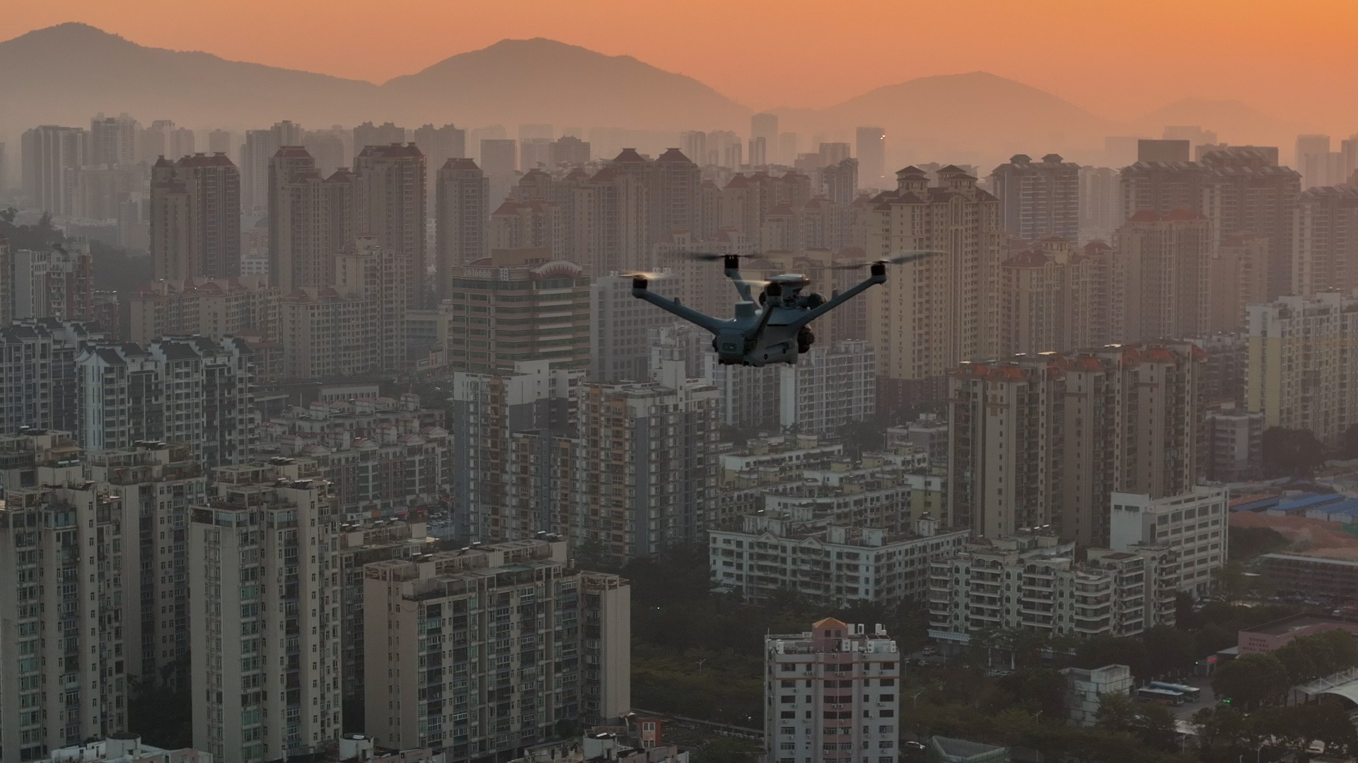 居民们牵着孩子去上学,老人在凉亭里边喝茶边聊天。抬头望去,一架无人机正缓缓升空,沿着楼宇上方巡查屋顶积水和消防通道情况。