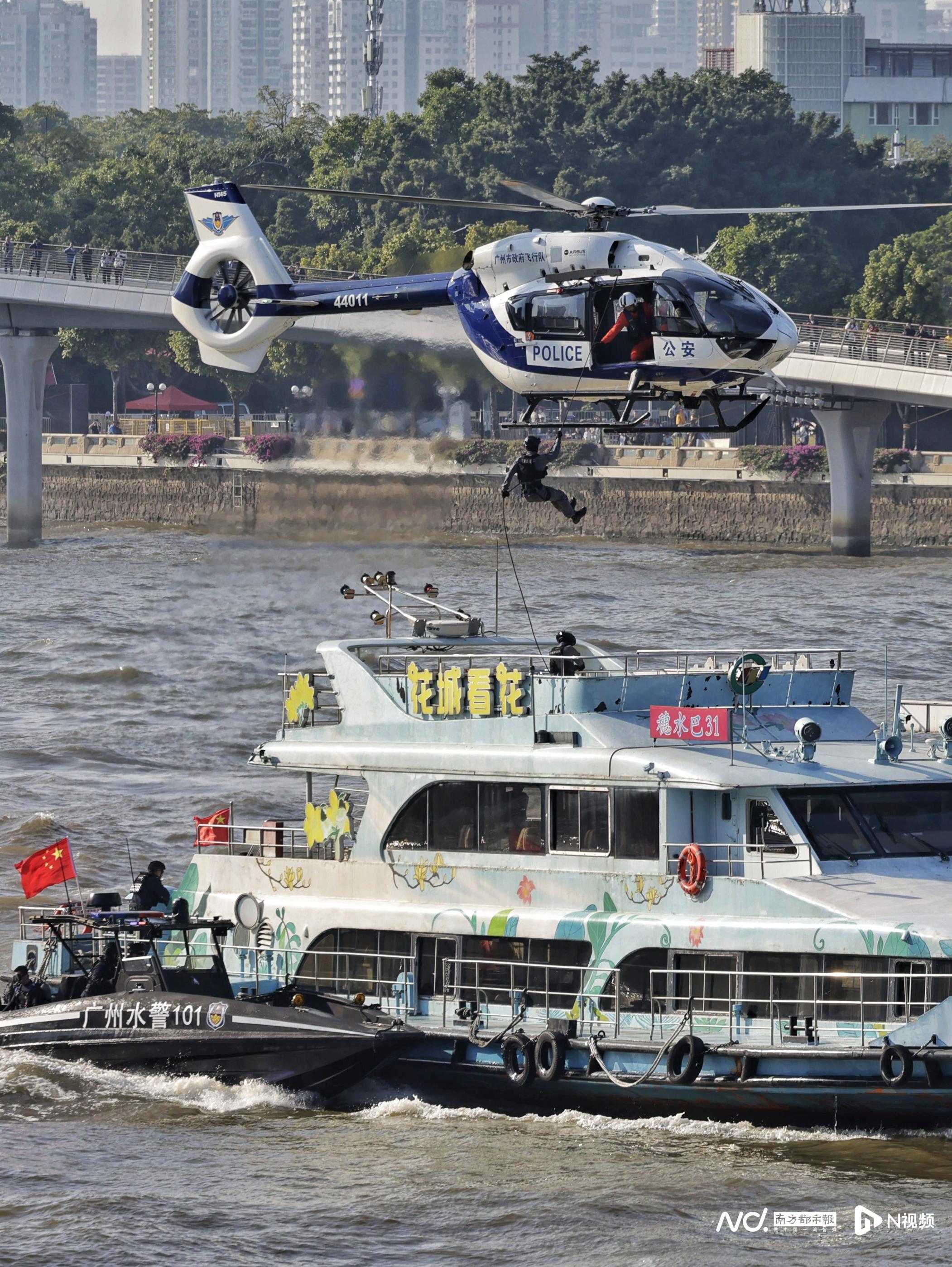 当日,水陆空全域协同警务实战演练成为活动亮点。南都记者看到,江面之上,水上警用舰艇编队高速巡航,尽显“水上铁骑”风采;天空中,特警队员从警用直升机索降而下,身手敏捷地完成垂直突入动作。此外,水上快艇、无人机、无人艇协同参与,先后开展江面反走私拦截、落水人员救援、无人机投放救生设备等实战科目演示,全面展示广州公安“水陆空”全域立体化巡逻防控体系的建设成果,让市民直观感受到平安守护的坚实保障。