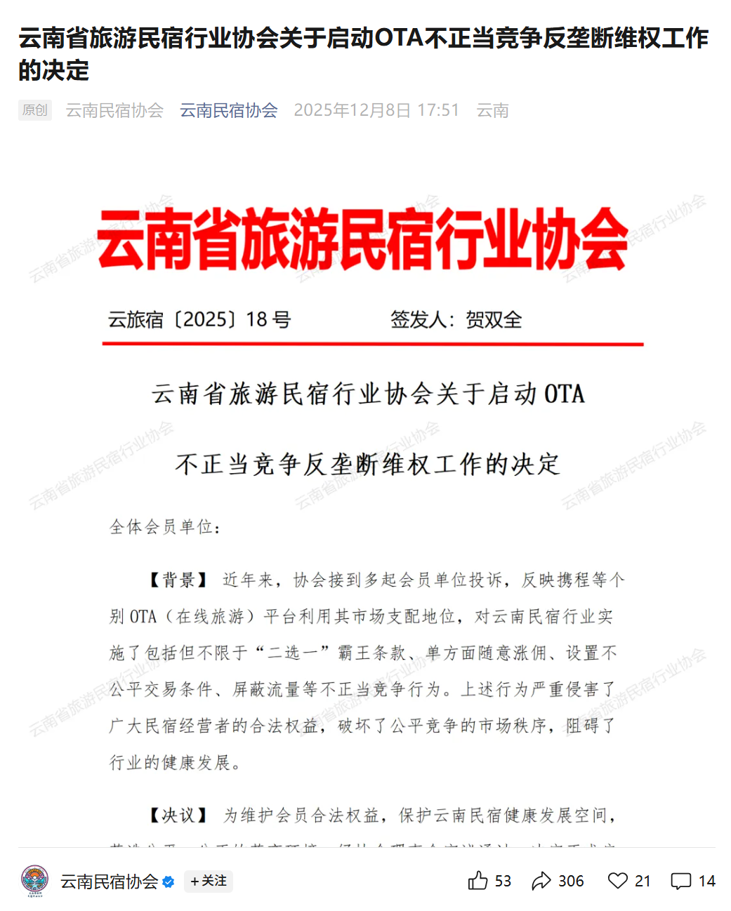 2025年12月8日,云南省旅游民宿行业协会发布《云南省旅游民宿行业协会关于启动0TA不正当竞争反垄断维权工作的决定》(下称《决定》),其中点名携程。