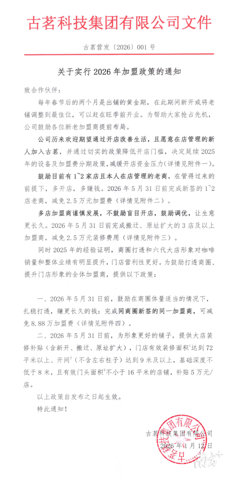2026年伊始,古茗发布加盟新政策。在延续设备及加盟费分期的基础上,古茗提出进一步减免加盟费、提供装修补贴,同时对新老加盟商再次强调“在店管理”的要求。