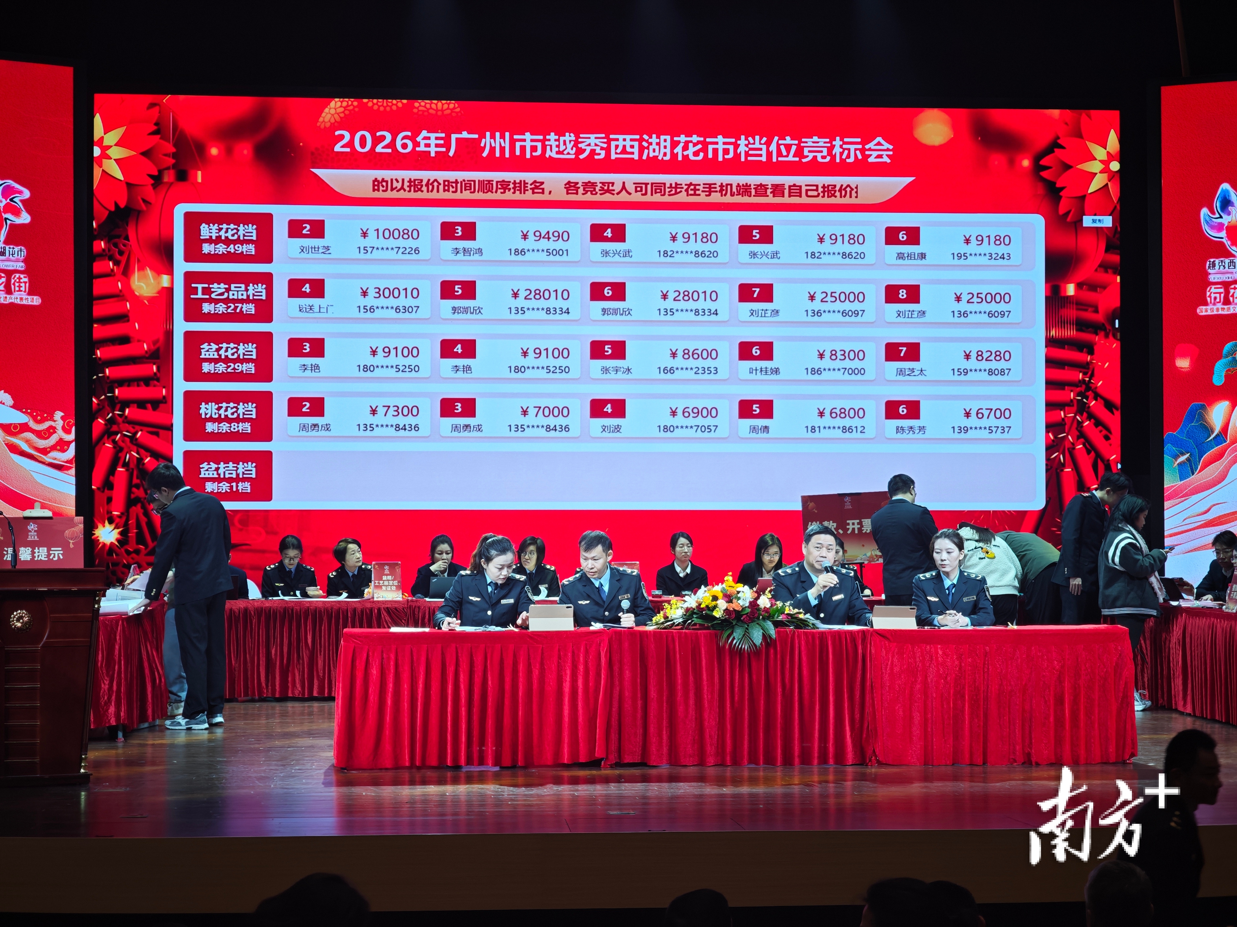 据悉,2026年越秀西湖花市将于2026年2月13日(腊月廿六)上午8:30至2月17日(正月初一)凌晨2:00,在教育路、西湖路举办。竞标现场>>