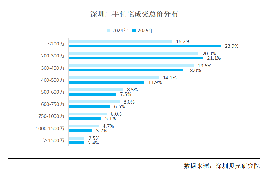 从价格区间看,刚性需求占据绝对主力。贝壳研究院数据显示,2025年总价300万以下的二手住宅成交占比高达45%,成为市场最活跃的价格段。