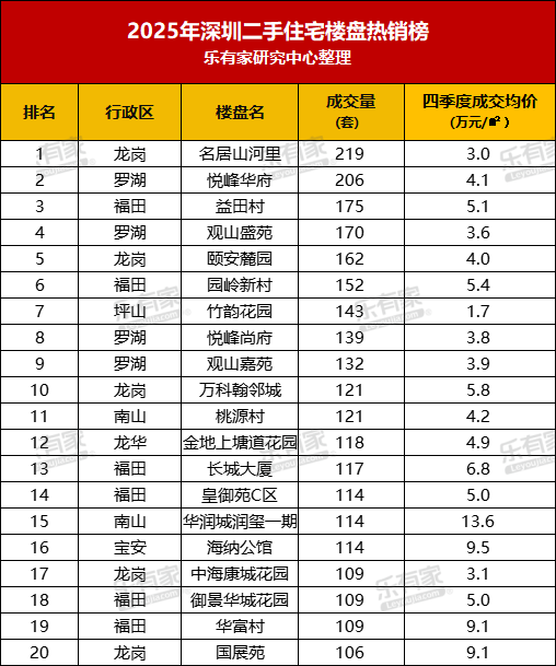 具体到楼盘,乐有家二手住宅热销榜显示,位于龙岗的“名居山河里”以全年219套成交位列楼盘榜第一,该小区属于次新房,价格较同地段新房具备优势,吸引大批刚需客。罗湖的悦峰华府、悦峰尚府等次新小区也持续热销,全年成交均超200套。福田的益田村、南山桃源村等大型社区,凭借成熟配套和较强居住属性,在市场中也保持高活跃度。