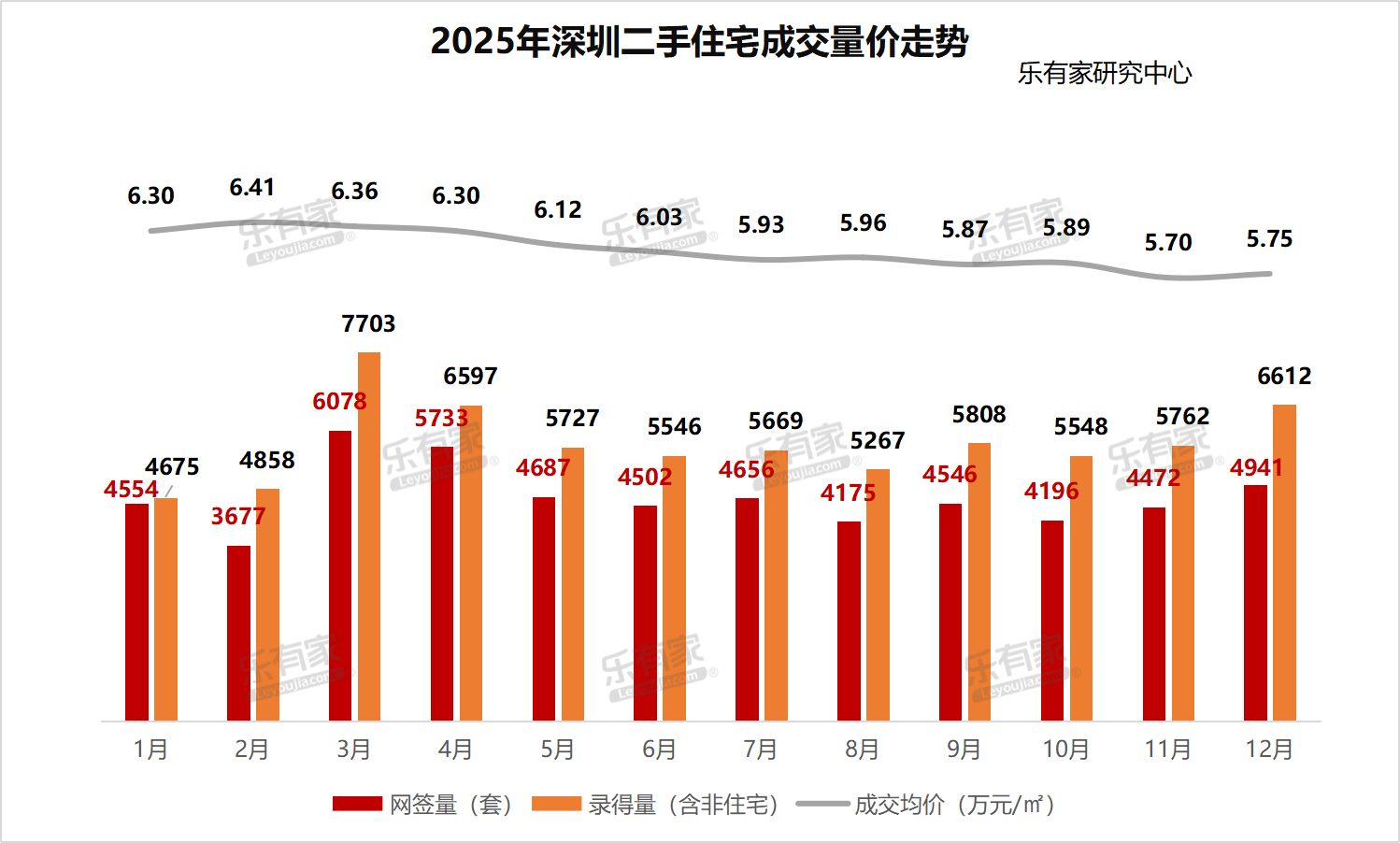 2025年的深圳楼市,二手住宅市场成为绝对主角。乐有家研究中心最新数据显示,2025年深圳二手住宅网签占比首次突破60%。与此同时,在“以价换量”的主旋律下,市场呈现“量涨价跌”格局,不少刚需与改善客户趁机“上车”或“换房”,推动二手房交易活跃度持续回暖,成交套数创下近五年新高。