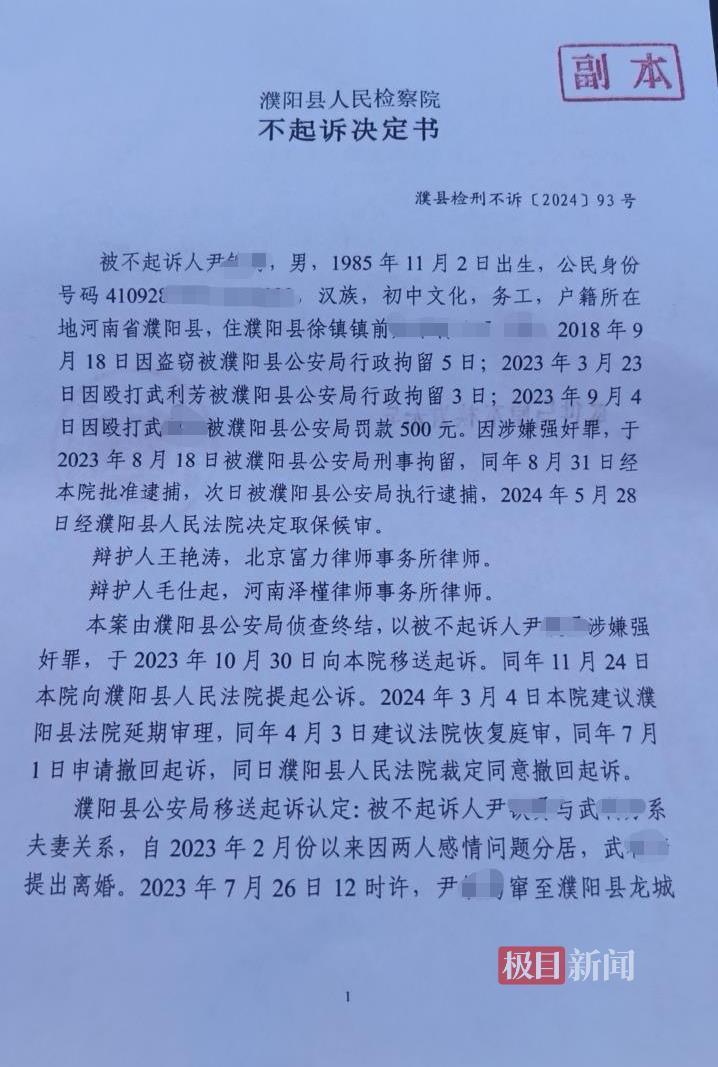 2023年10月30日,濮阳县公安局以尹某涉嫌强奸罪向濮阳县检察院移送起诉,濮阳县公安局移送起诉认定:尹某与武某系夫妻关系,自2023年2月份以来因两人感情问题分居,武某提出离婚。2023年7月26日12时许,尹某窜至濮阳县龙城国际东区13楼,在主卧室内对武某实施强奸。同年11月24日濮阳县检察院向濮阳县人民法院提起公诉。2024年3月4日濮阳县检察院建议濮阳县法院延期审理,同年4月3日建议法院恢复庭审,同年7月1日申请撤回起诉,同日濮阳县人民法院裁定同意撤回起诉。2024年5月28日经濮阳县人民法院决定取保候审。