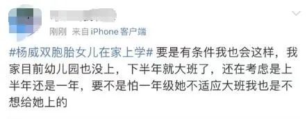 杨威称,因为孩子去年生了好几场病,于是他决定,让双胞胎女儿暂时不去学校上学了,选择在家上学。