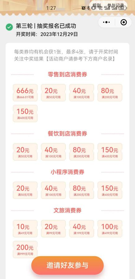 本轮消费券报名时间为12月17日10:00-12月19日23:59,开奖时间为12月22日。用户报名成功后,每类券均有机会获1张,最多4张。