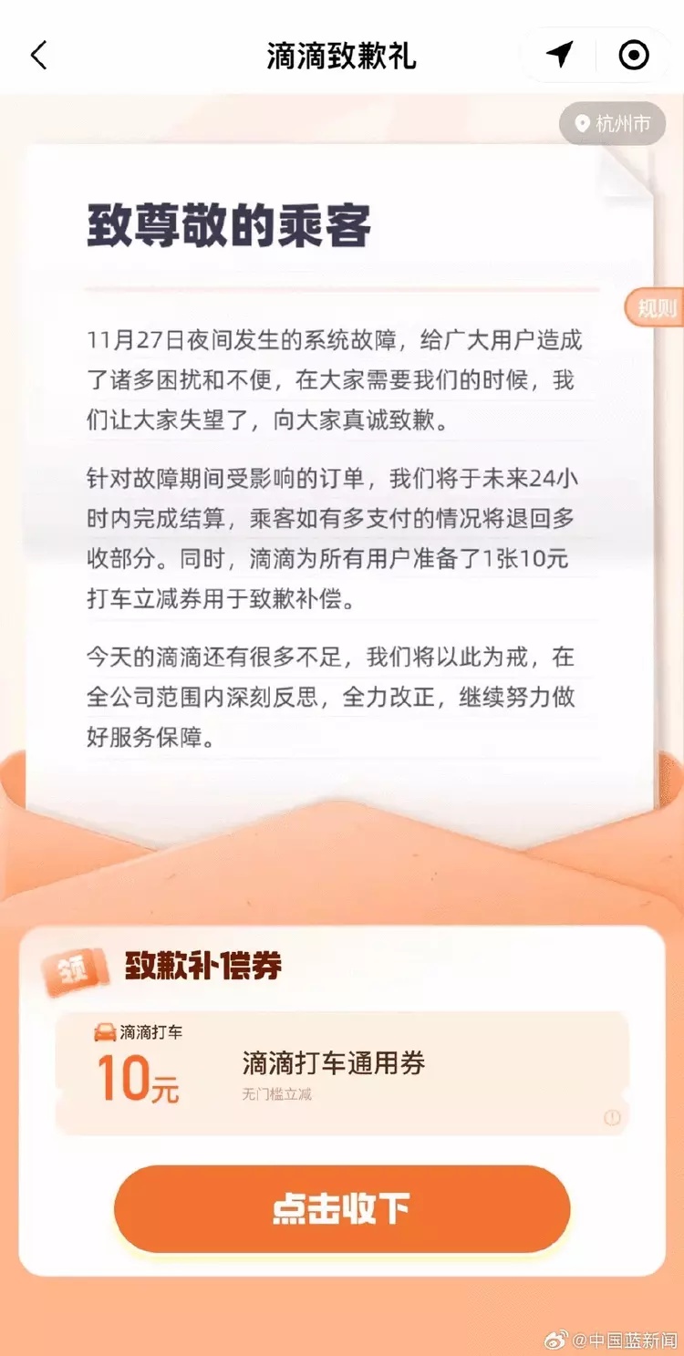 11月29日,滴滴出行通过微博再次致歉并表示,各项服务恢复的同时,我们在28日启动了内部复盘调查。初步确定,这起事故的起因是底层系统软件发生故障,并非网传的“遭受攻击”,后续我们将深入开展技术风险隐患排查和升级工作,全面保障服务稳定性,尽最大努力避免类似事故再发生。目前,滴滴App的所有服务已经全部恢复。另据消息,滴滴在小程序发布道歉声明,并补偿所有用户10元优惠券。 但许多网友表示优惠券加载异常,无法领取。你领到滴滴的致歉补偿券了吗?