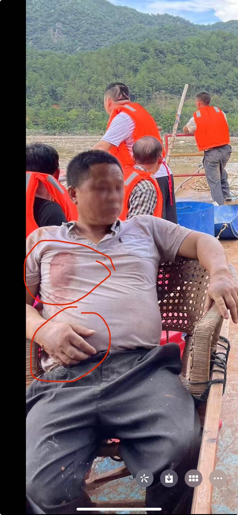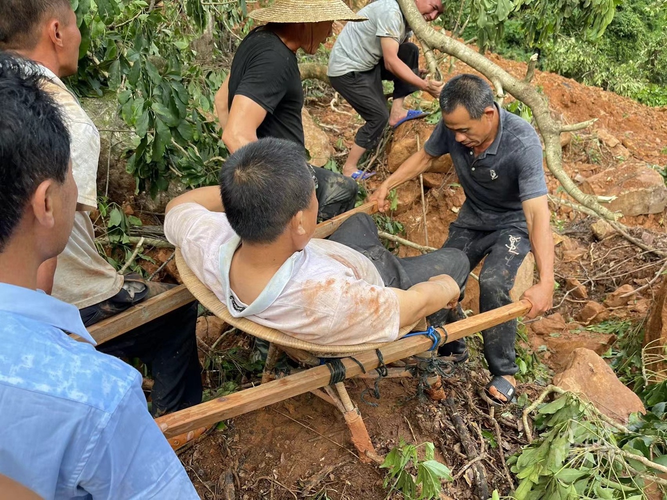 “16日晚上,村里就接到几个务工人员因暴雨在工作中被困的消息,我们就开始寻找他们,因为滑坡很多地方都不敢去。找到的时候发现他胸部附近受伤了,是大树倒下来压到肋骨,血虽然止住了,但一直没用药,手部肿了起来,情况还是比较危险。”
