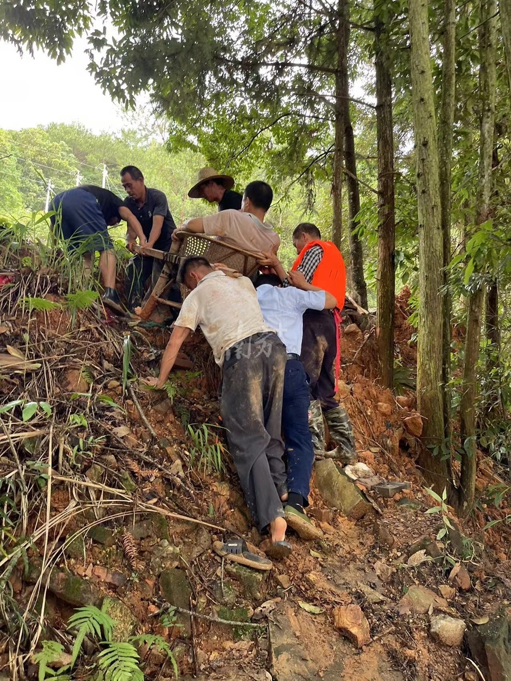 6月17日10时,蕉岭县长潭镇长东村干部和群众在山里找到了受伤的务工人员。原本在周边小水电站工作的他们,打算撤离至村里安全地带,无奈被困在半路。