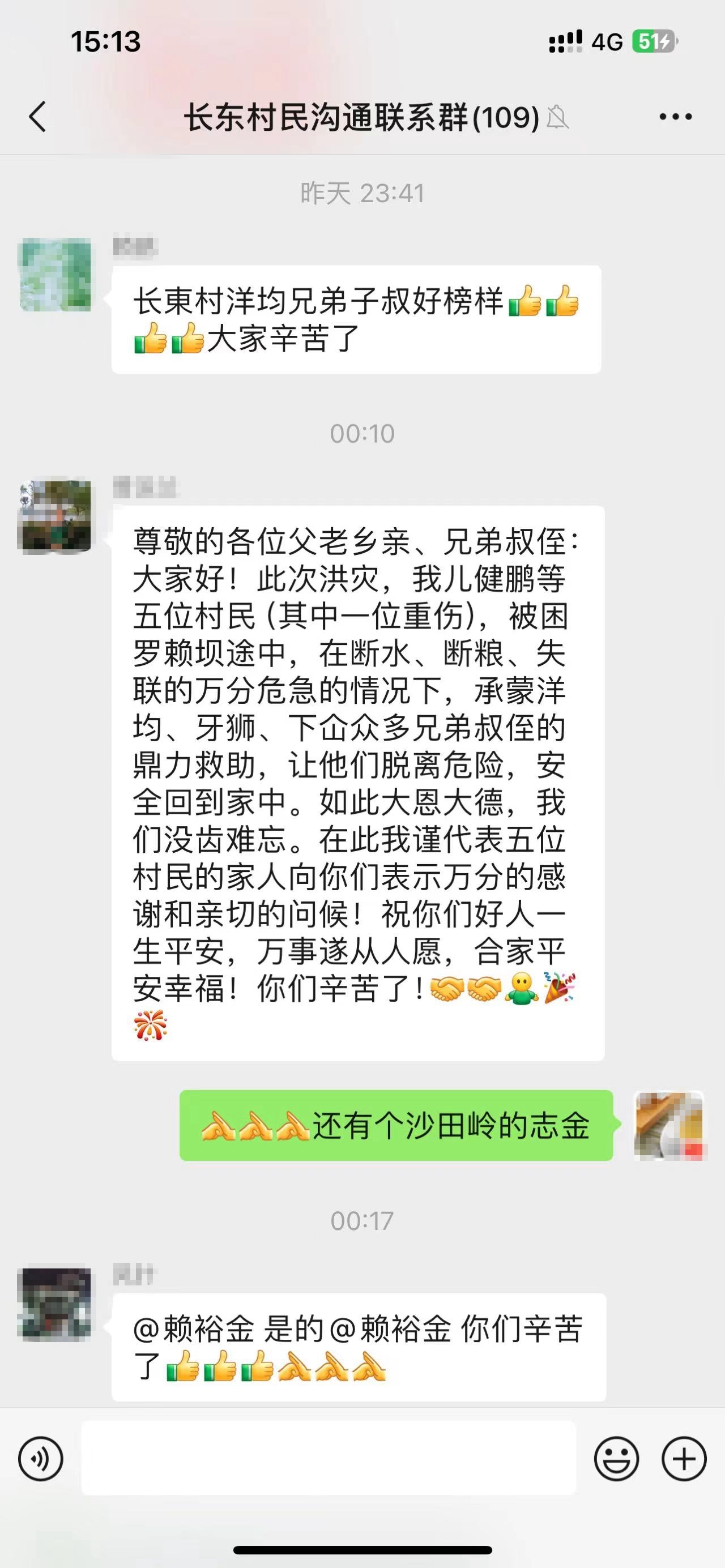 “村里安排了船只先送我们到码头区域,村党支部书记他们就回去继续做好救灾工作,我们7人合力做好转移工作。”这7人,既有村里的农家乐老板,亦有本村、邻村的群众,以及南方电网的一名员工。
