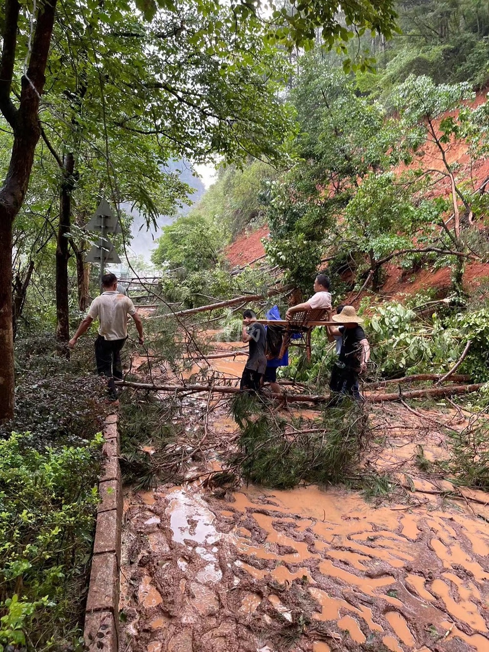 按照原来的计划,道路行不通,他们只能又换了一条。遭遇山体滑坡的山路,情况不容乐观。道路上有不少大树横在路上。对于没有工具的一行人,只能选择最安全的小路通行。行走中,他们还得顾着伤者,避免造成二次伤害。