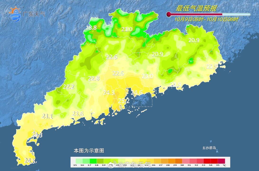9日,南部沿海市县多云,局部有阵雨,其余市县晴间多云。最低气温:粤西北市县15~18℃,粤西、珠江三角洲中南部市县23~25℃,其余大部分市县18~23℃。