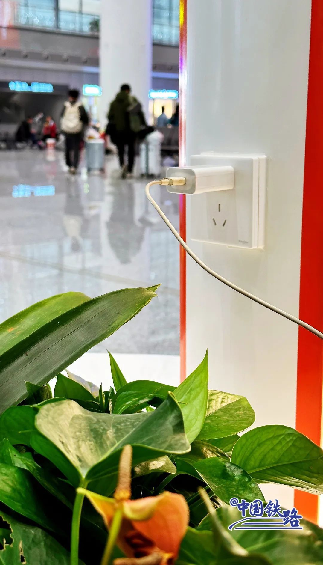 候车室共有24个灯柱(南北各12个),每个灯柱配有两处充电插孔,方便旅客手机充电。