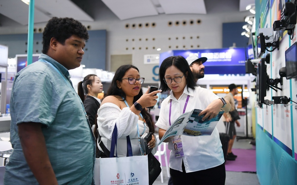 10月15日,在第134届广交会上,来自秘鲁的采购商在车载监控产品展台参观。新华社记者 邓华 摄第134届广交会吸引众多海内外参展商、采购商,其中参加进口展的43个国家和地区的650家企业中“一带一路”共建国家参展企业占比约六成,参会的重点市场采购商“一带一路”共建国家较上届同期增长11.2%。