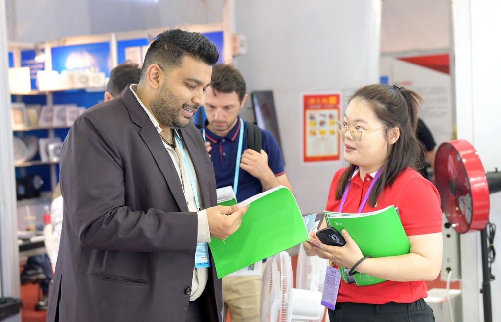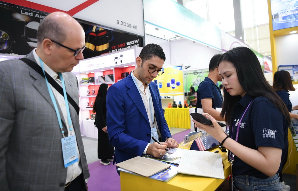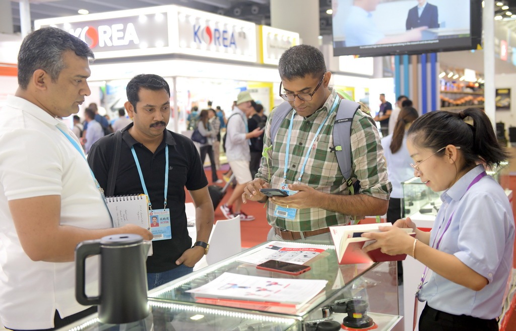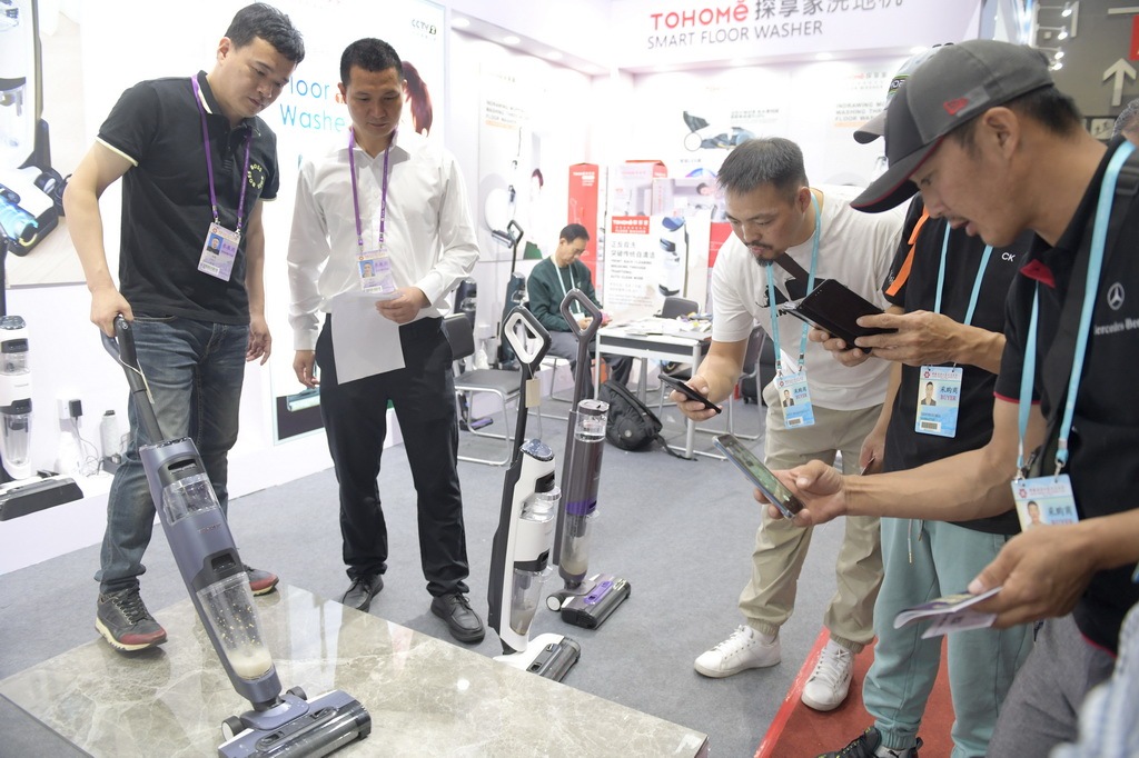10月15日,越南客商在广交会上参观、选购洗地机。新华社记者 卢汉欣 摄