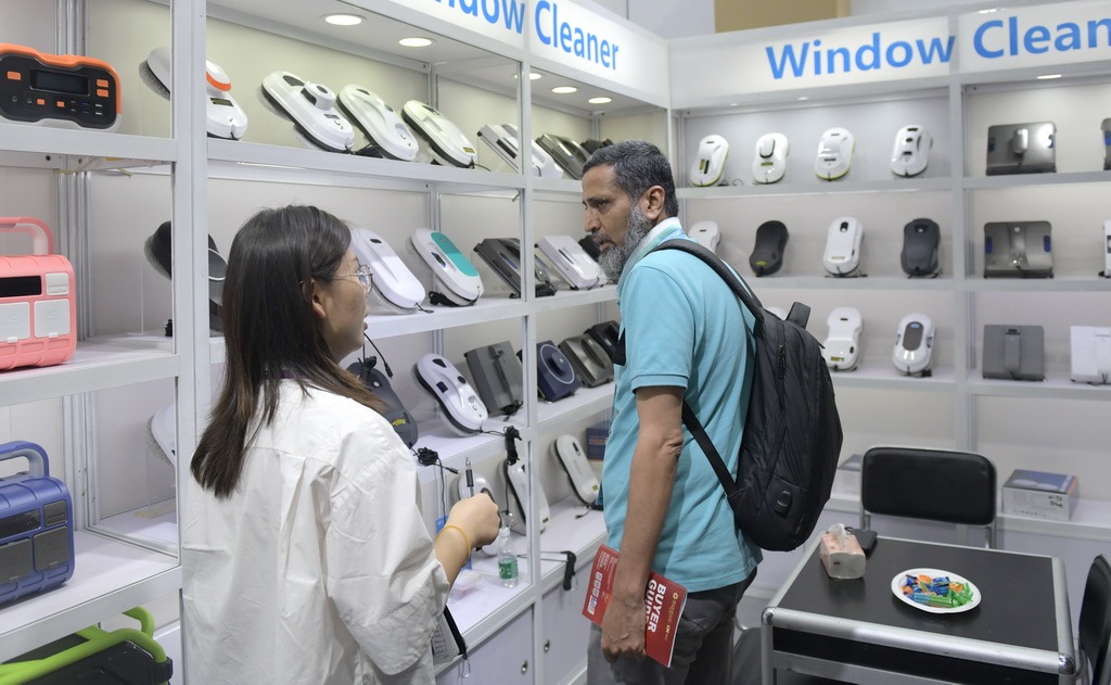 10月15日,巴基斯坦客商在广交会上参观、选购玻璃清洗设备。新华社记者 卢汉欣 摄