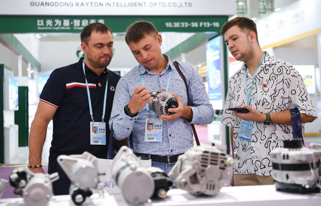 10月15日,在第134届广交会上,俄罗斯客商观看汽车零配件。