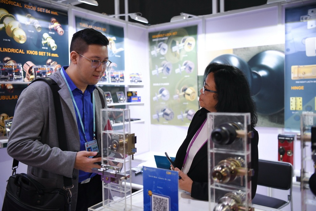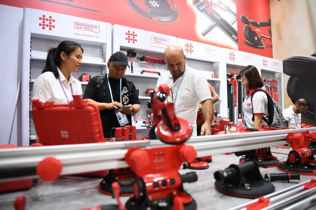 10月16日,来自伊拉克的采购商(右)在铺贴工具展台洽谈。新华社记者 邓华 摄