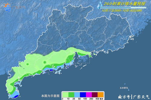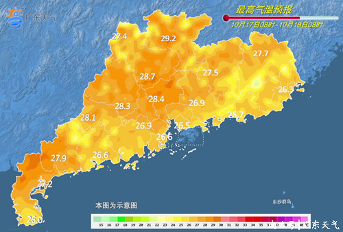 17日,粤西和珠江三角洲南部市县阴天间多云有阵雨局部大雨,其余市县多云。最高气温:粤东市县25~27℃,其余大部市县28~31℃。
