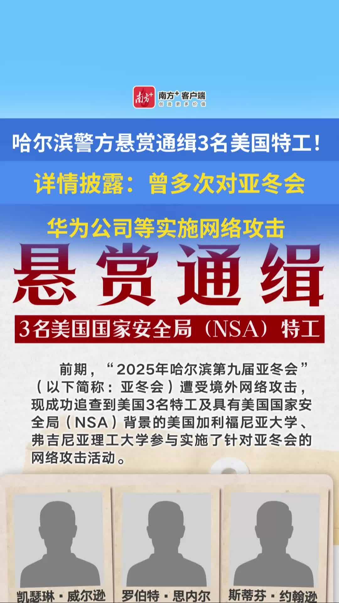 哈尔滨警方悬赏通缉3名美国特工!详情披露:曾多次对亚冬会,华为公司等实施网络攻击