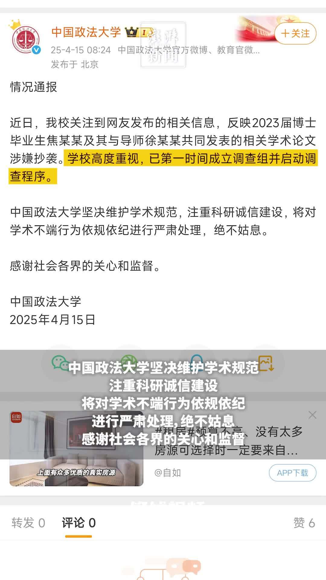 中国社科大博士后被指读博期间论文抄袭续:法大称已启动调查