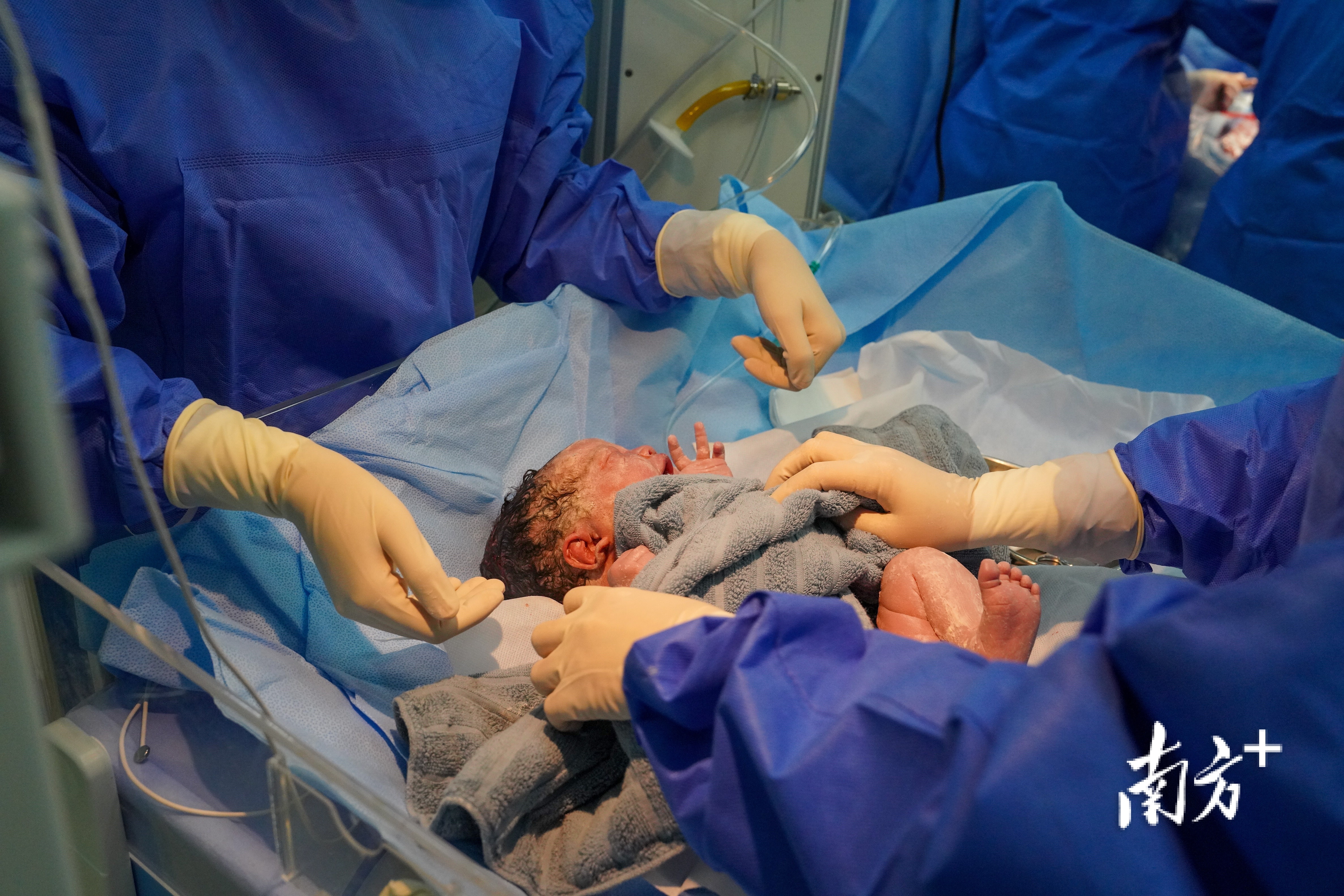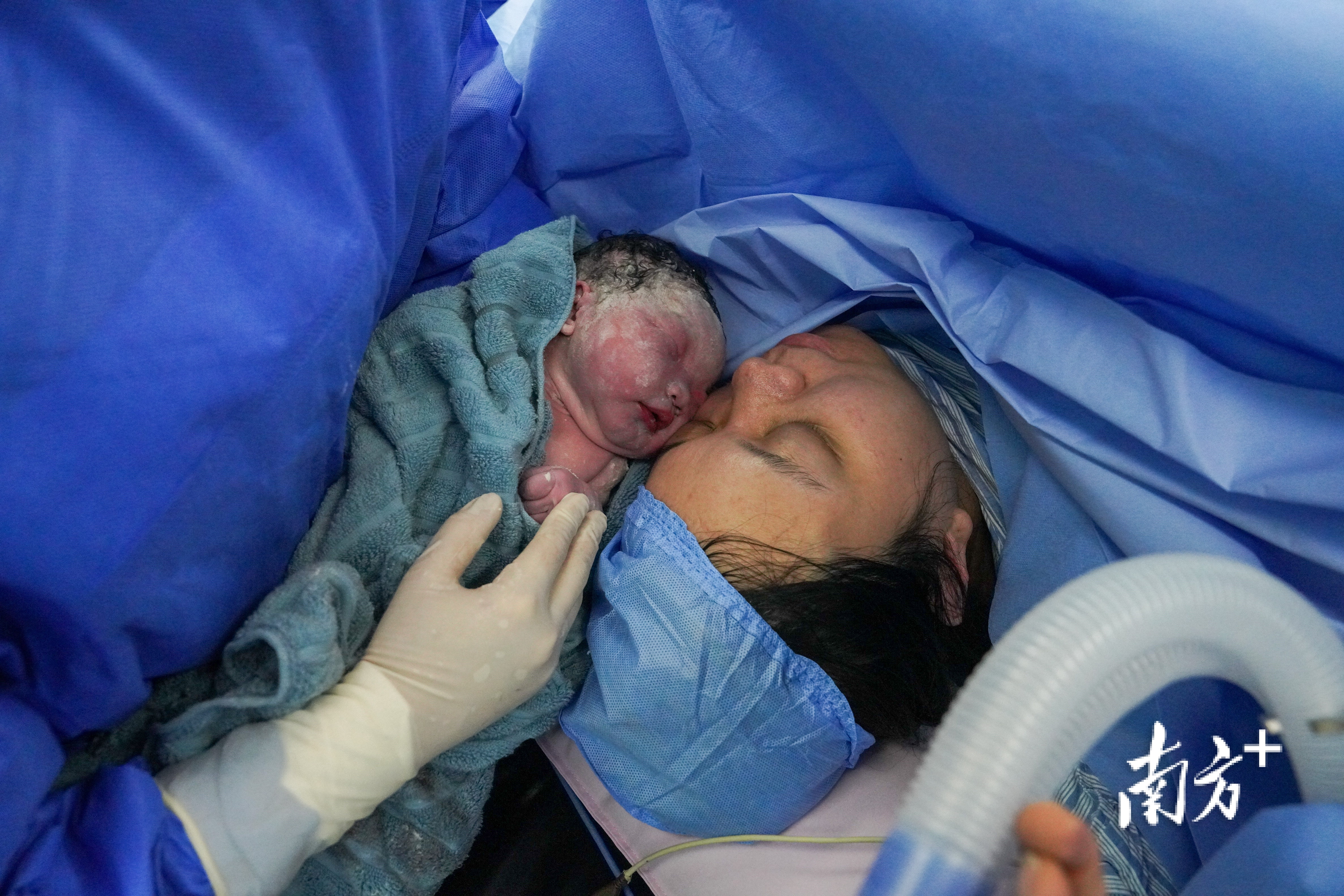 手术医生周曼萍和何丽清相视一笑,与助产士谢丹互道恭喜,手术室里洋溢着新春的喜庆氛围。