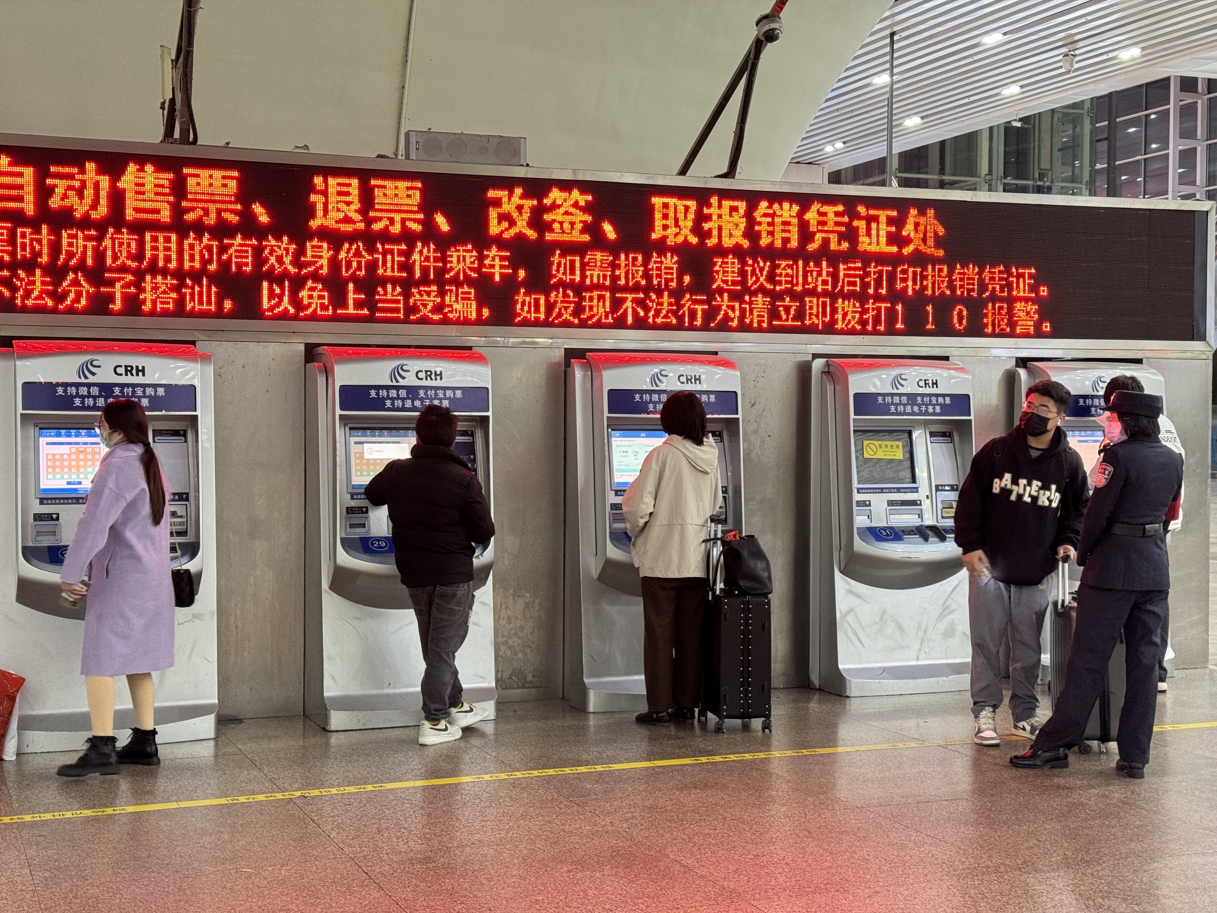 7日晚,记者在广州南站看到,自动售票机附近均有工作人员,对购票者的问题进行解答。站内也做出相关提示,称要警惕不法分子搭讪,谨防上当受骗。