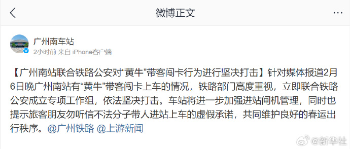 据上游新闻此前消息,近日春运火车票紧缺,在广州南站,有黄牛称给200元即可跟随刷票旅客身后闯卡进入。对此,广州南站回应称将给予坚决打击,维护春运秩序。