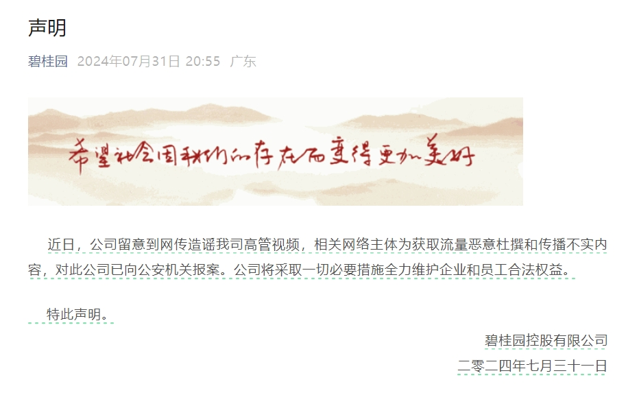 7月31日晚,碧桂园通过微信公众号发声明, 称“近日公司留意到网传造谣我司高管视频,相关网络主体为获取流量恶意杜撰和传播不实内容,对此公司已向公安机关报案。”碧桂园通过声明表示,公司将采取一切必要措施全力维护企业和员工合法权益。南方+记者 葛政涵 南方日报、南方+客户端原创,未经授权不得转载 编辑 邵玉梅 订阅后可查看全文(剩余80%)