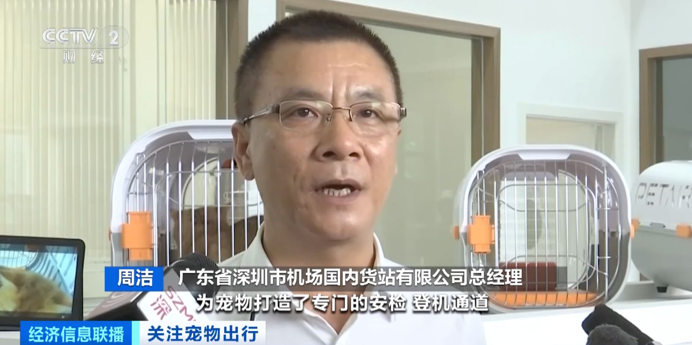 广东省深圳市机场国内货站有限公司总经理 周洁:为宠物打造了专门的安检、登机通道。专人看护、定时巡视,由于航班延误导致的滞留宠物,可以为宠物提供免费的寄养服务。