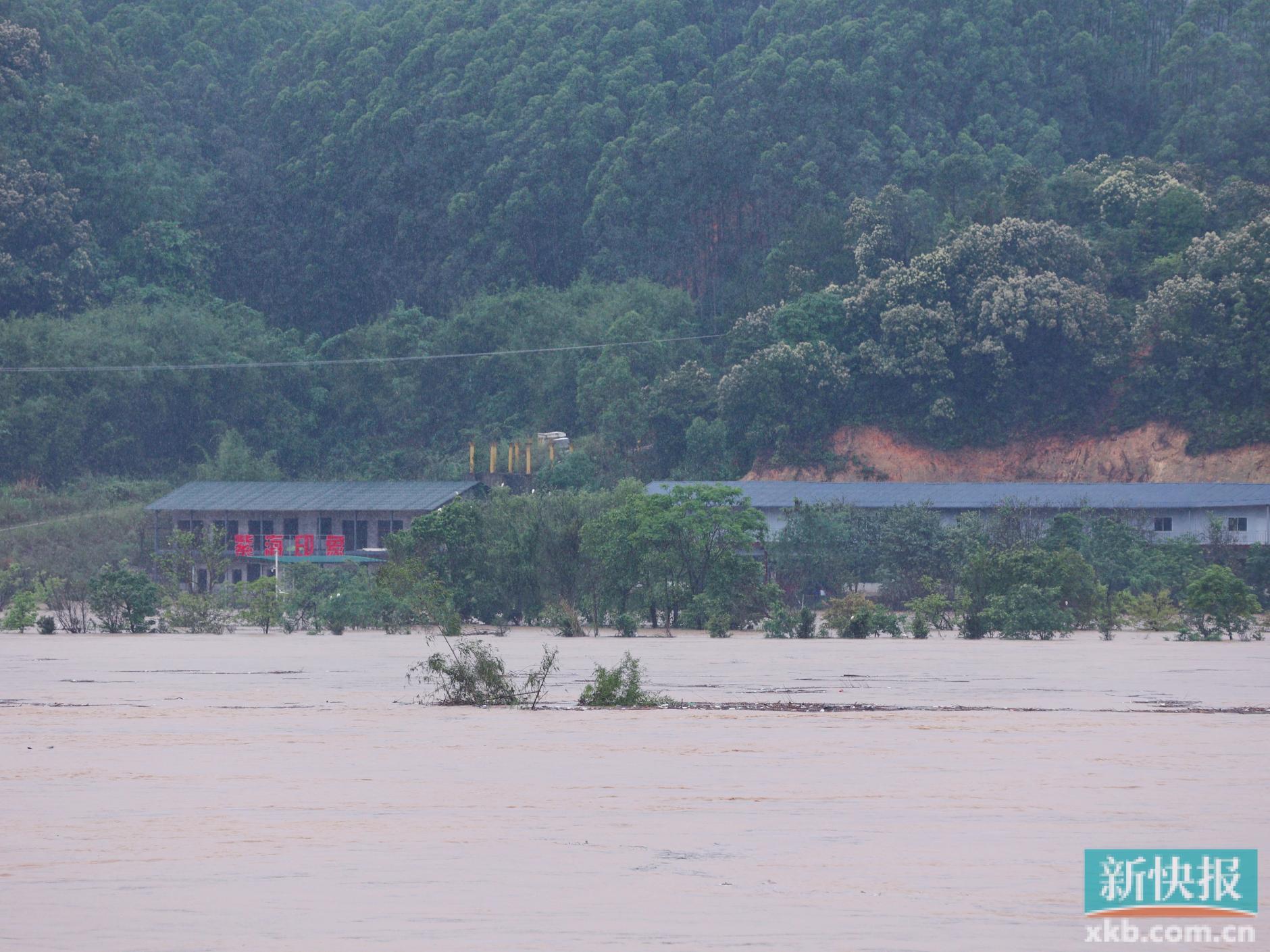4月21日上午,新快报记者来到英德市连江口镇的浈阳峡风景区,这里是北江的英德段。记者目测,英德段的北江水位较高、水面广阔。由于两岸都是山,因此很多泥土砂砾都随着持续不断的雨水而流入了江里,而且流速很快。浑浊的江面不仅漫过了部分沿岸设施,还淹到了江对面的一些房屋。