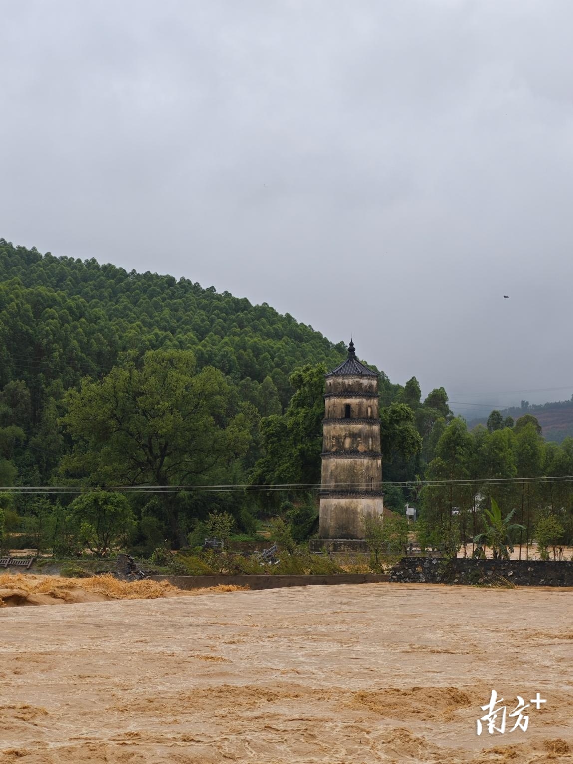 韶关武江救援现场水势汹涌,龙归水龙归镇段涨水明显,河旁的文武阁塔矗立其中,被洪水围困如同“孤岛”。文武阁塔数百米开外,隔河相望的公路正遭受严重水浸,交通完全中断。