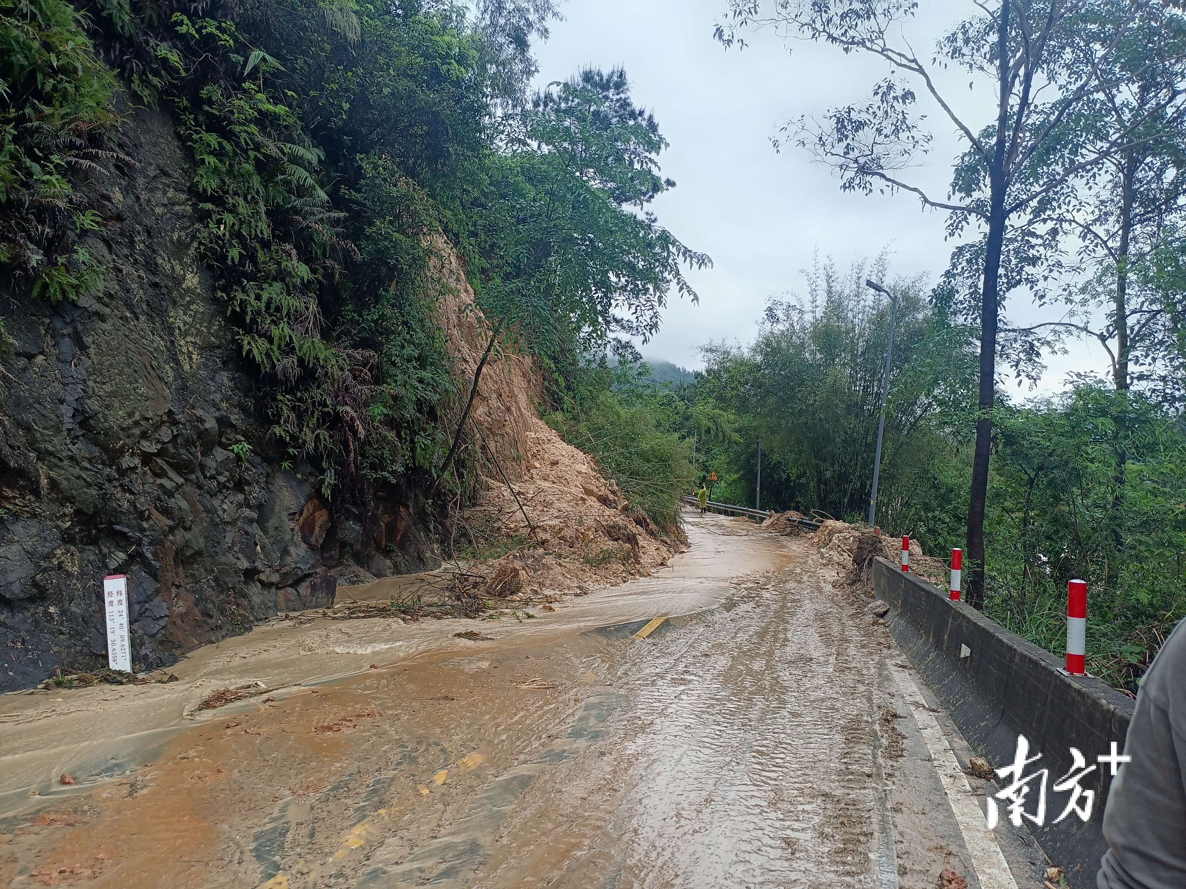 21日下午3点,记者在韶关武江区龙归镇318县道看到,由于强降雨导致的山体滑坡,当前几处临山的道路被山石和泥土阻断,仍有水流从山体冲下道路。