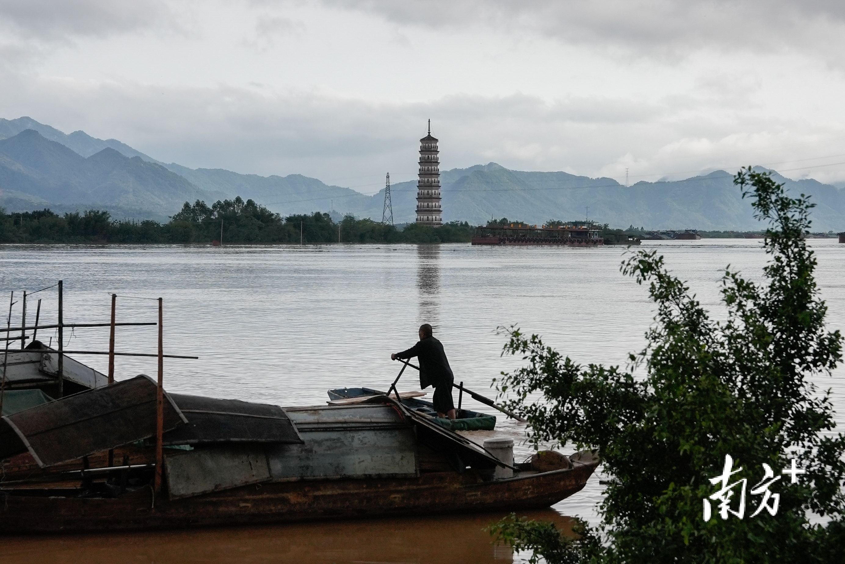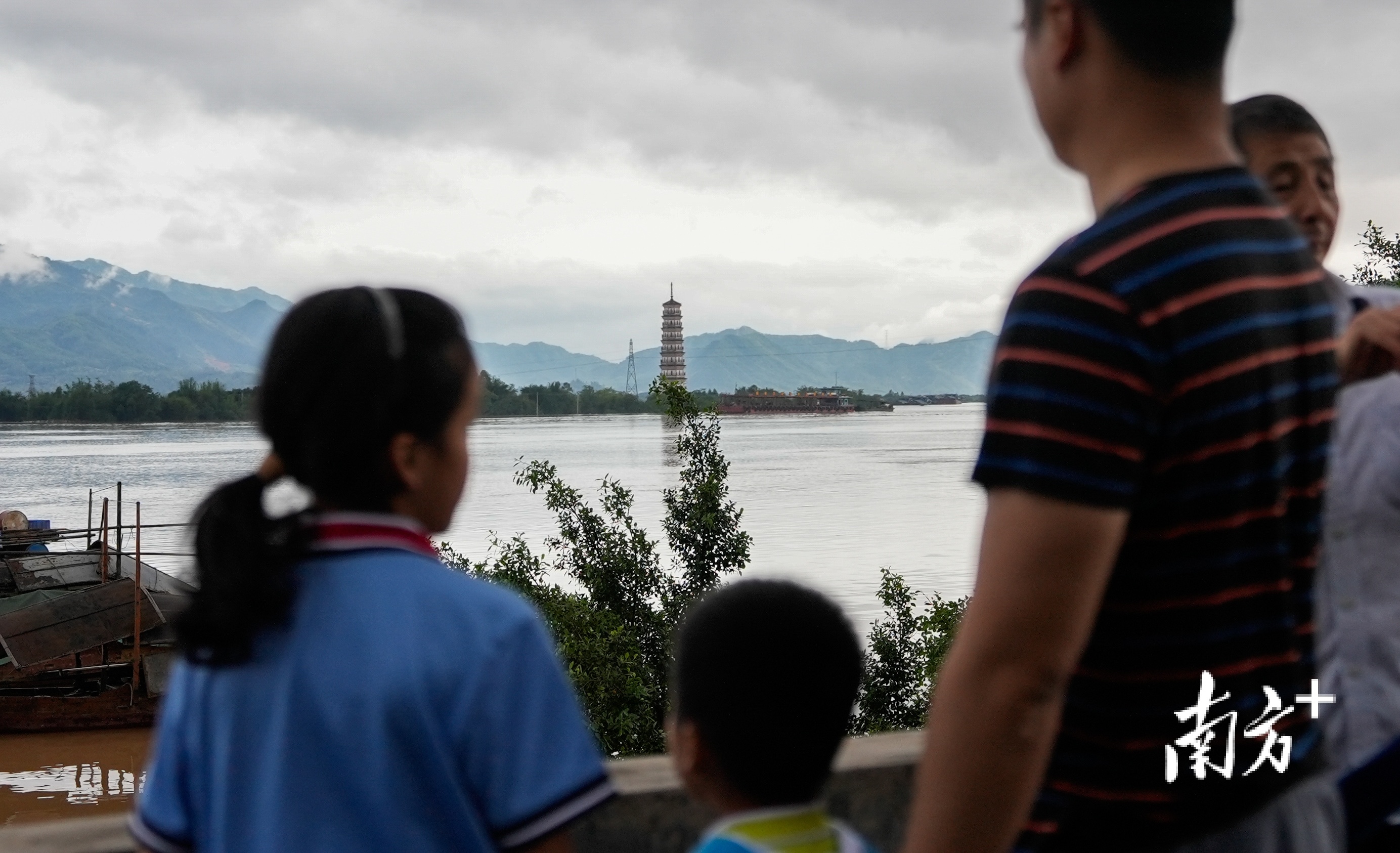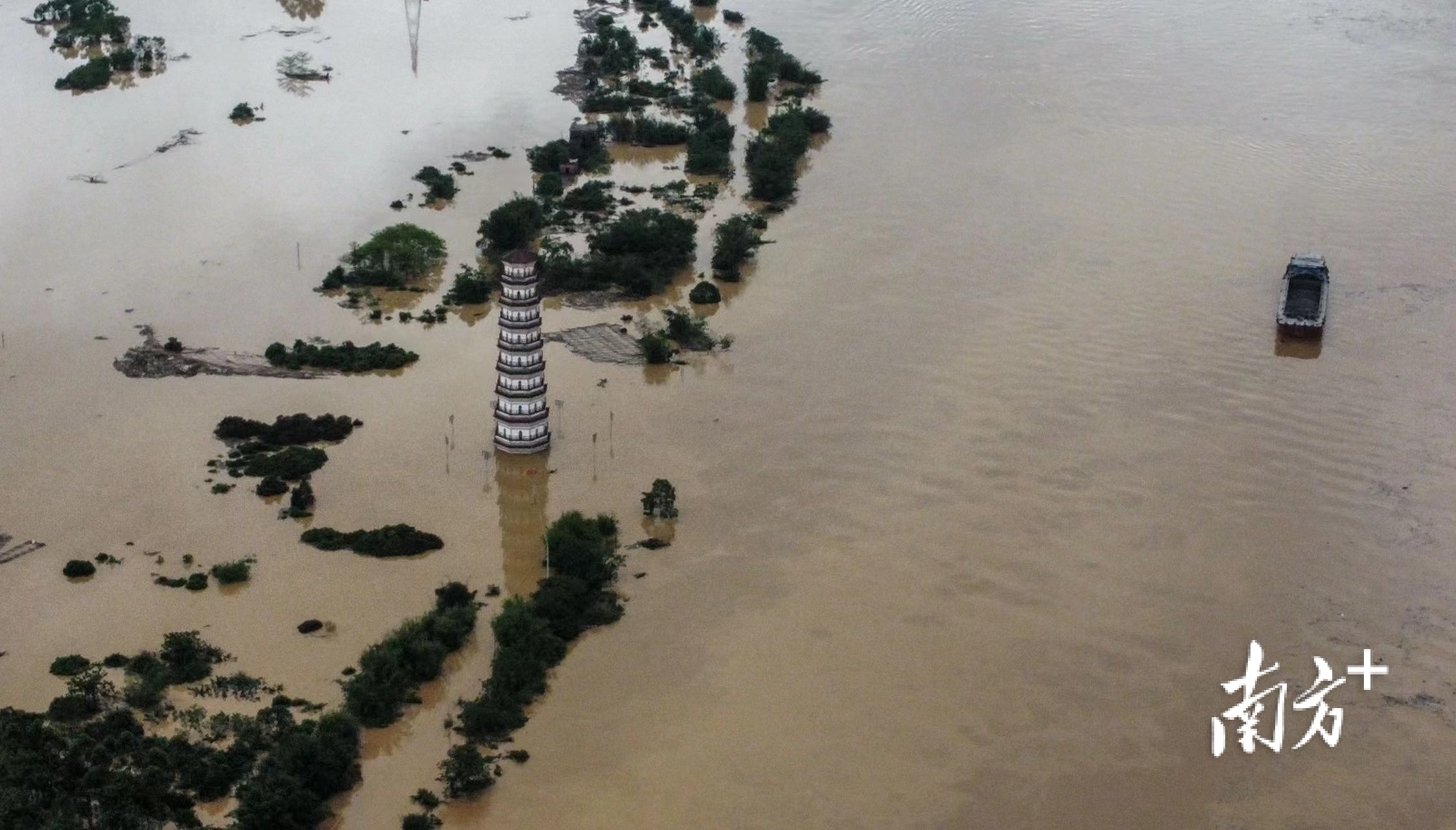 21日下午,记者在英德市区北江沿岸看到,当地地标文峰塔已被江水包围。市区对岸的江南村等数条村庄也已被江水浸泡。