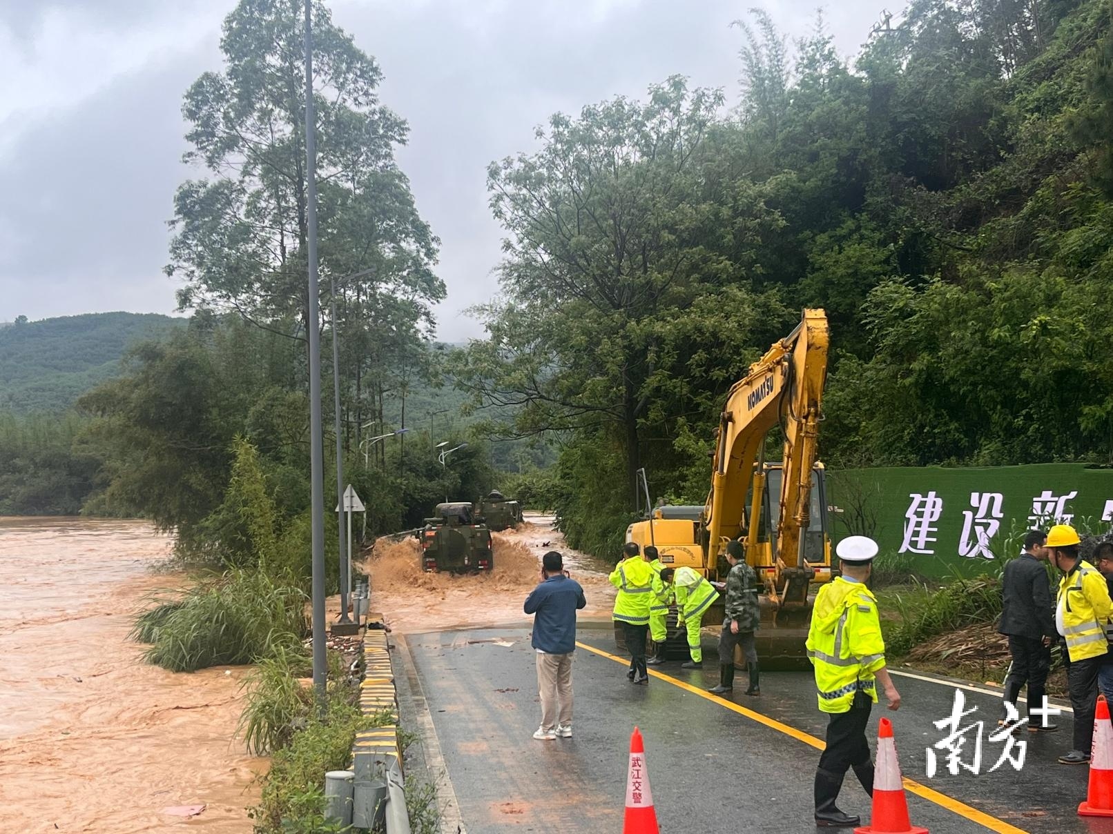 韶关武江:涨水淹没公路,当地紧急进行道路抢修