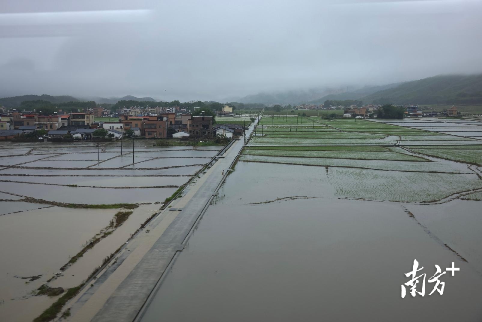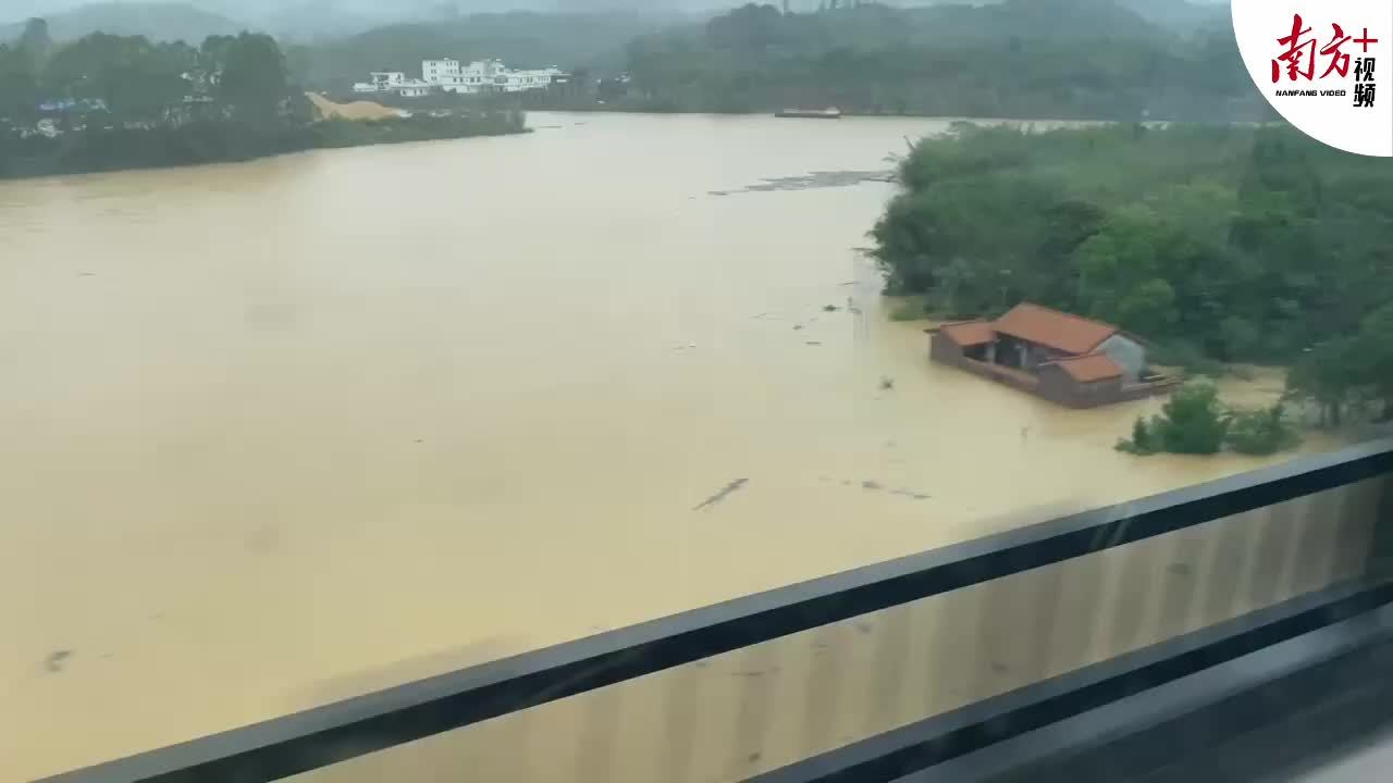 4月21日上午,高铁列车途经韶关曲江区、清远英德市能看到不少低洼地区涨水,房屋农田被淹。